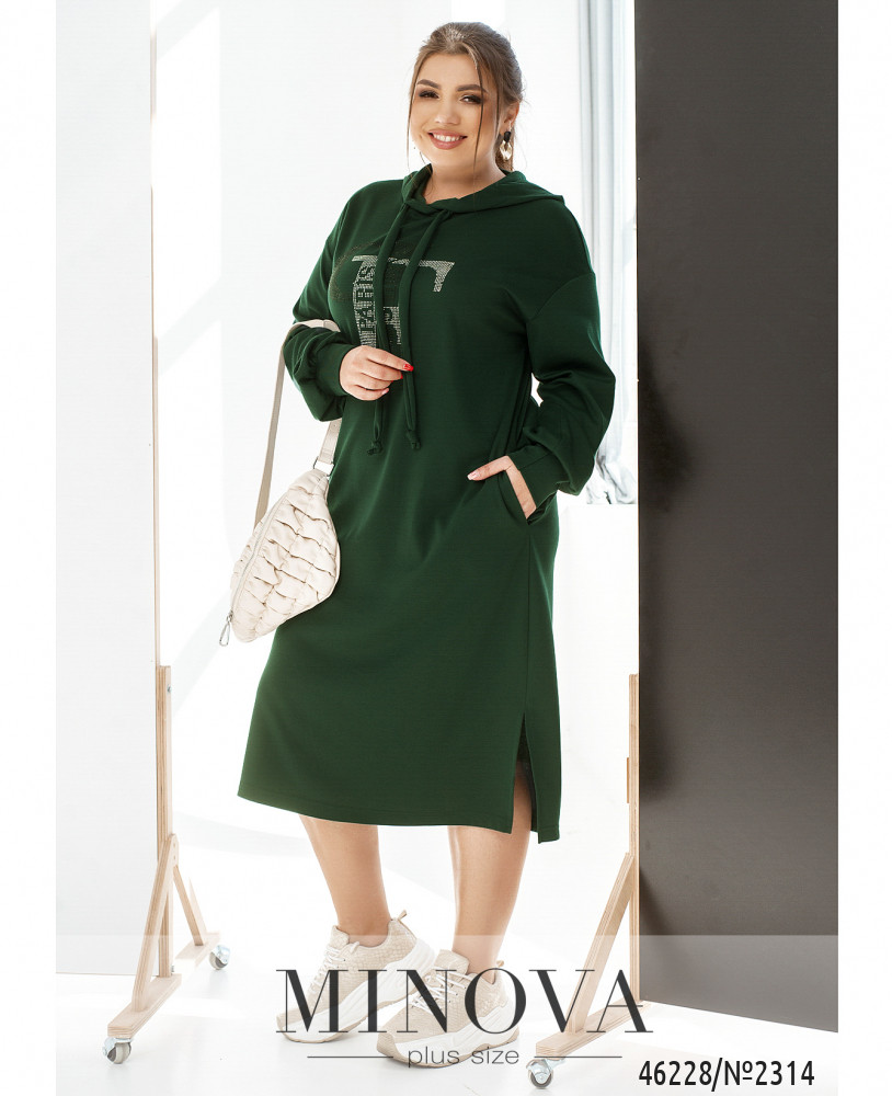 Стильное спортивное платье может стать любимой вещью для женщины, ценящей практичность и не забывающей о модных тенденциях. Модель дополнена длинными рукавами с манжетами и приспущенной линией плеч, а также карманами в боковых швах и капюшоном. Платье украшает декоративная аппликация спереди.