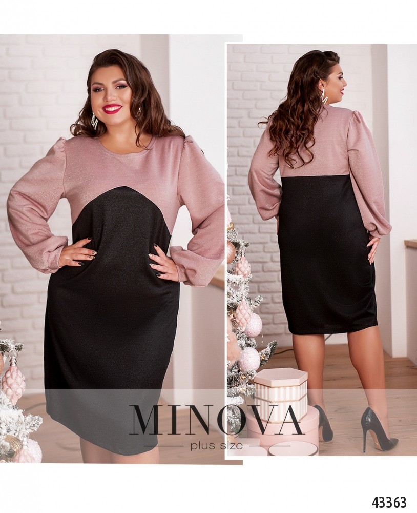 Элегантное минималистичное платье плюс сайз, без застёжек и карманов. Рукава с мягкими манжетами, без пуговиц. Верх контрастный, по спинке ровная линия, спереди - треугольная. Ткань с люрексом.