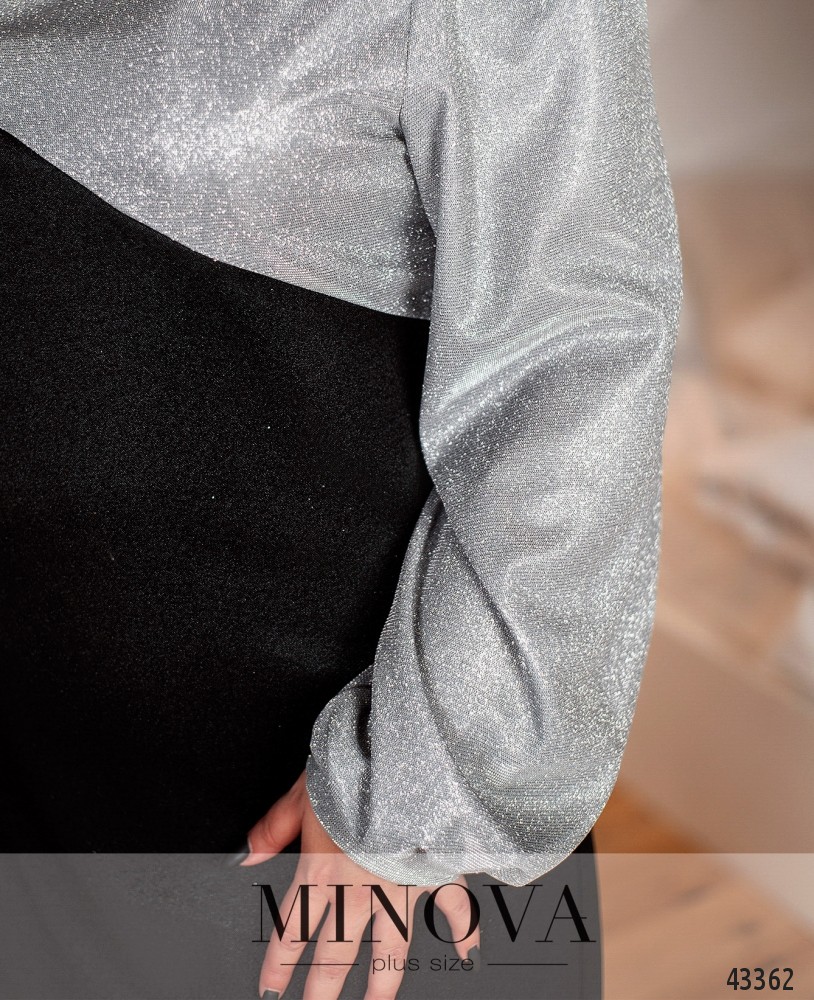 Элегантное минималистичное платье плюс сайз, без застёжек и карманов. Рукава с мягкими манжетами, без пуговиц. Верх контрастный, по спинке ровная линия, спереди - треугольная. Ткань с люрексом.