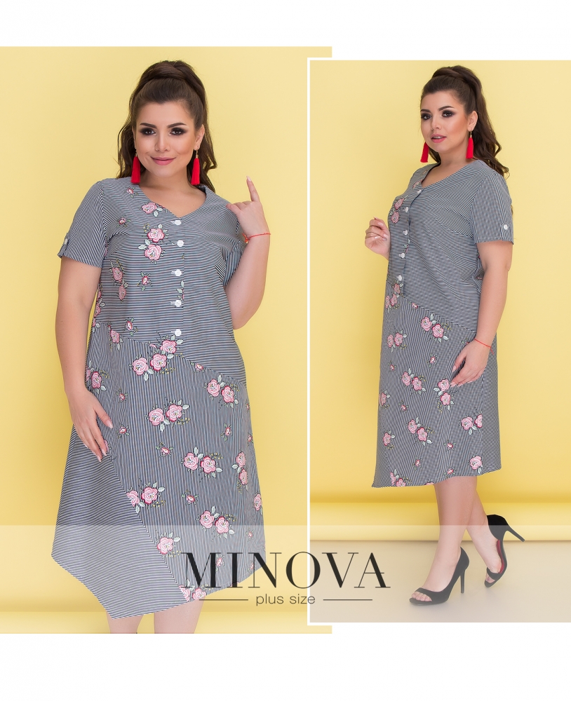 Платье асимметричного кроя с короткими рукавами. Рукава дополнены декоративными пуговицами. Лиф платья застегивается на пуговицы. Подол дополнен отрезной вставкой по диагонали.