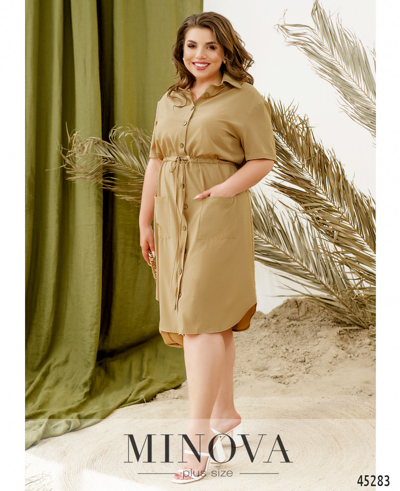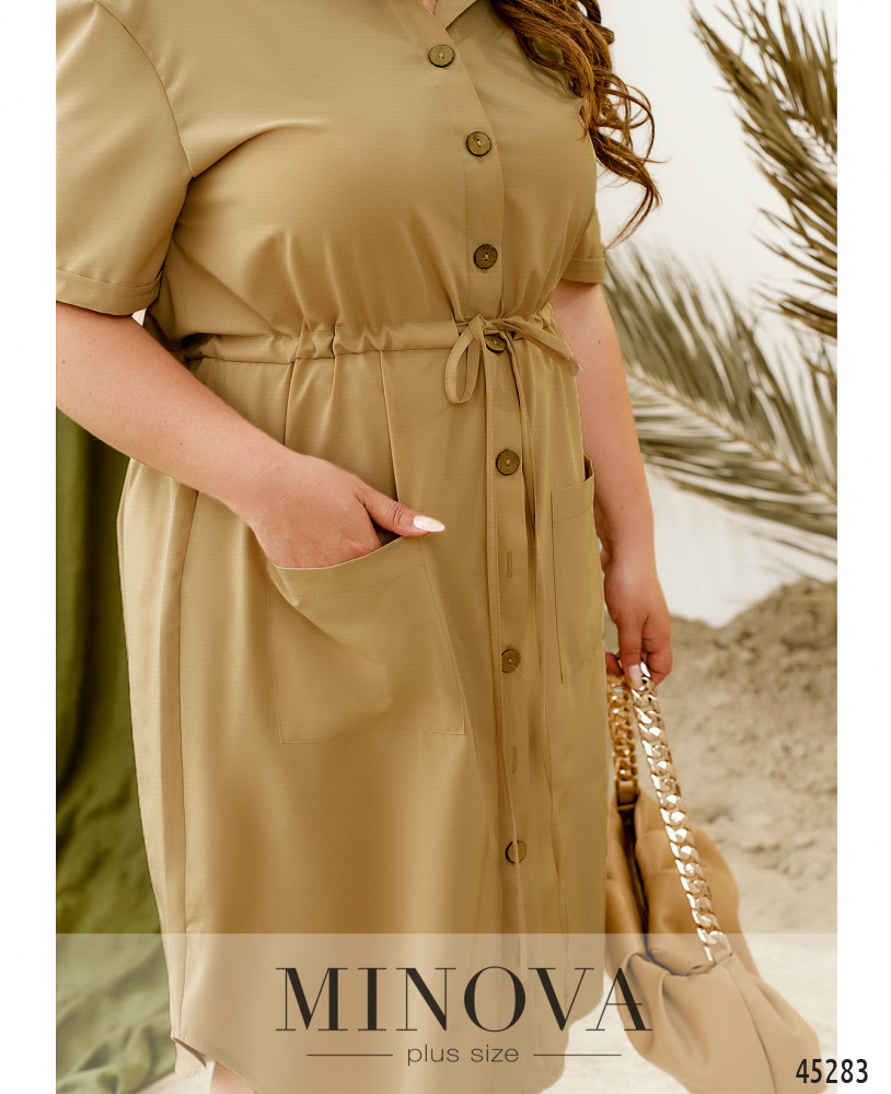 Минималистичное однотонное платье-рубашка с короткими рукавами - идеальное решение для жаркого летнего дня. Модель с воротником и пуговицами на планке спереди дополнена накладными карманами на бедрах и декоративным шнурком, вшитым в талию, который дает возможность подчеркнуть талию.