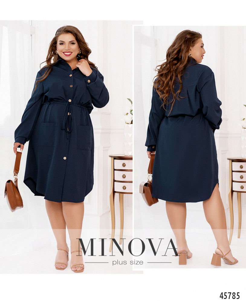 Минималистичное однотонное платье-рубашка с длинными рукавами - идеальное решение для жаркого летнего дня. Модель с воротником и пуговицами на планке спереди дополнена накладными карманами на бедрах и декоративным шнурком, вшитым в талию, который дает возможность подчеркнуть талию.