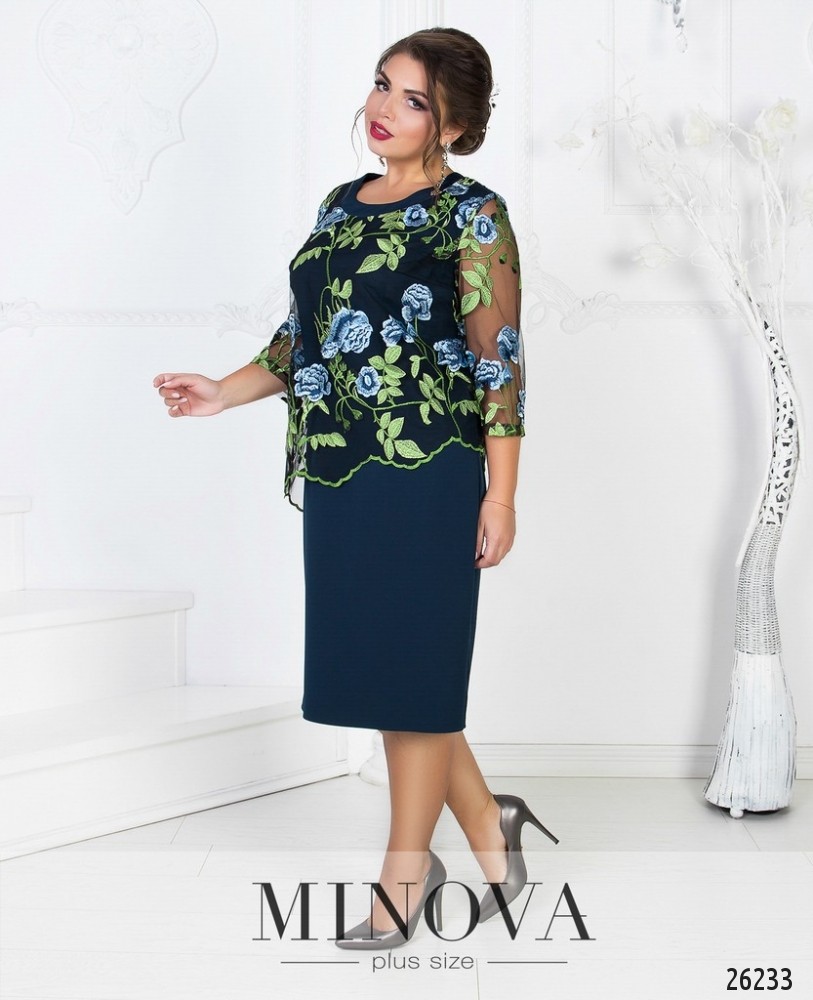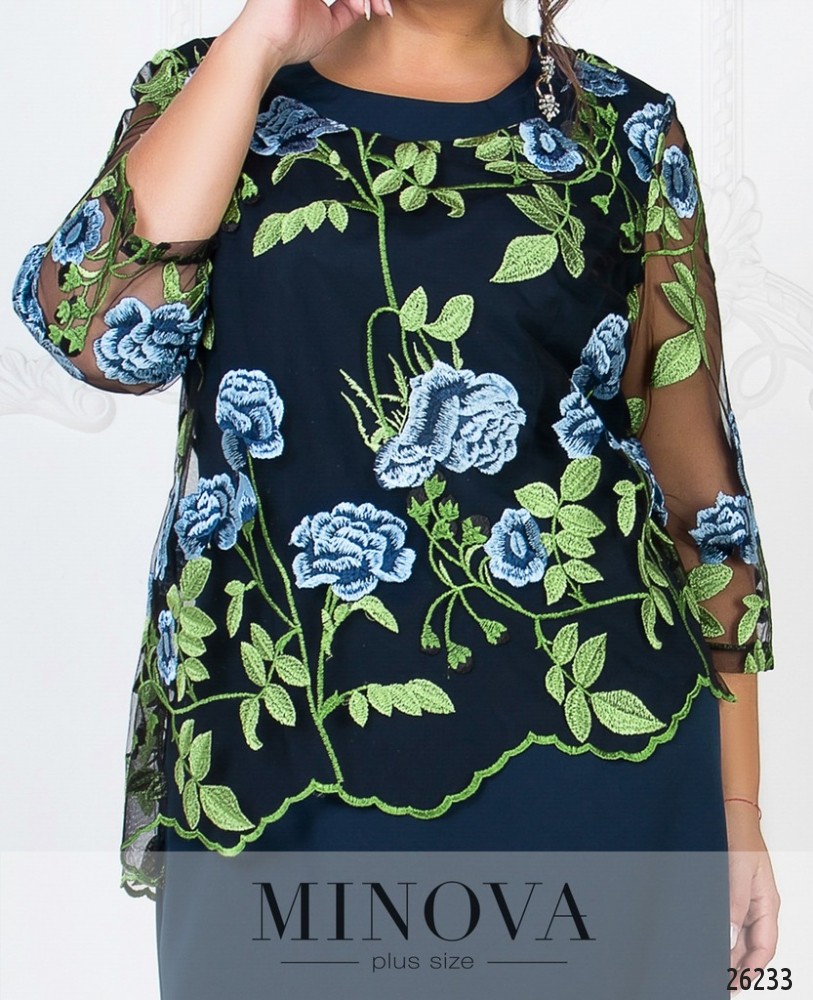 Романтичное платье полуприлегающего силуэта с асимметричной сеткой, расшитой цветами. Нижний слой состоит из плотной однотонной ткани. На спине скрытая молния и разрез по линии шага. Сетка пришита к платью и не снимается. Рукава так же изготовлены из сетки.