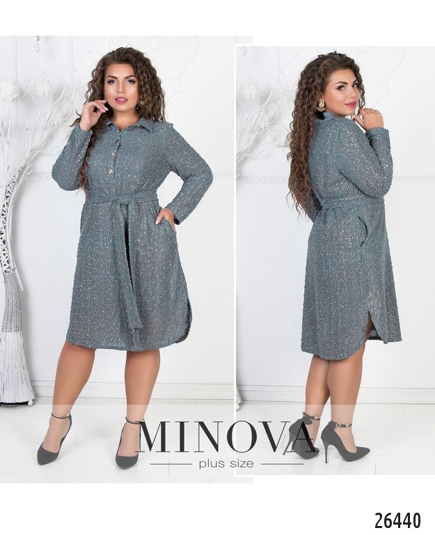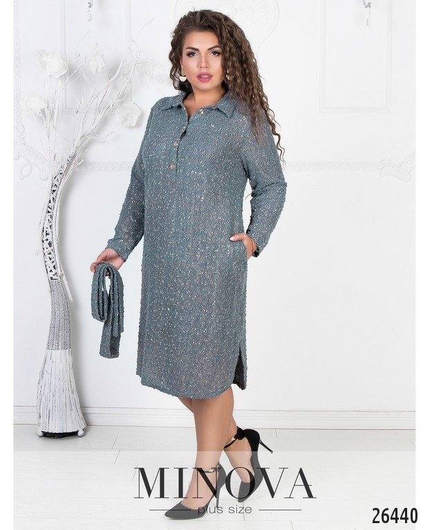 Яркое платье-рубашка прямого кроя изготовлено из трикотажа букле и декорировано яркими пайетками. Талию можно акцентировать пояском, который идет в комплекте. Рукава полной длины. Подол закруглён и по бокам небольшие разрезы, которые придадут свободы движениям.