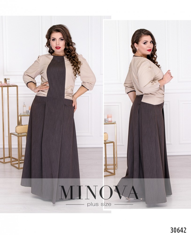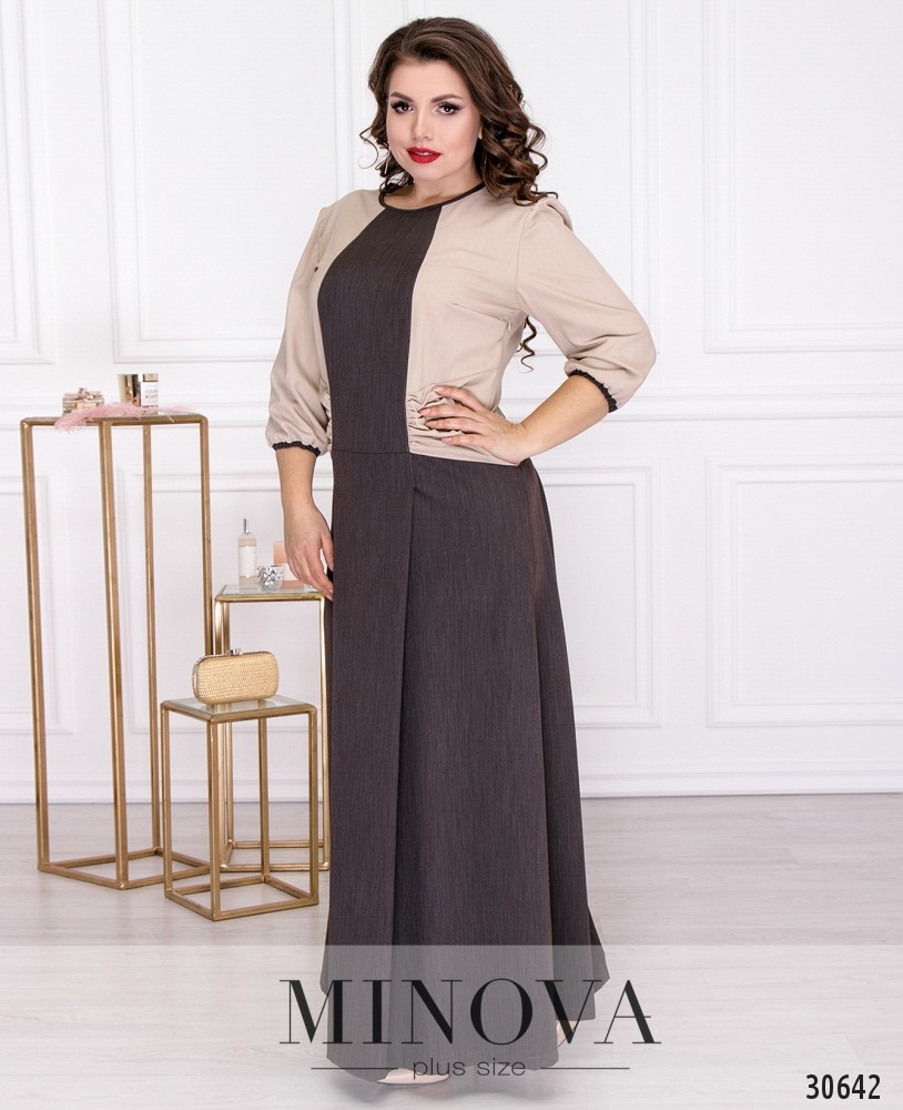 Элегантное платье-макси с расклешенным подолом. Отрезной лиф платья из контрастной ткани собран в драпировку по бокам. Рукава-фонарики собраны в контрастные манжеты. Объемный подол собран клиньями. На спине платье застегивается на пуговицу.