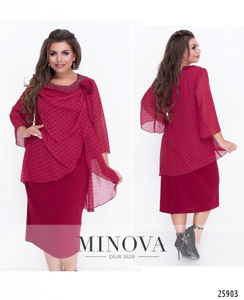 Платье с пришитой драпированной накидкой с мелкими стразами и объемным цветком. Нижний слой – платье футляр из плотной однотонной ткани. Верхний слой – полупрозрачный шифон с рисунком. Накидка удлинена на спине. Свободные рукава длиной ¾. Изделие без молний и застежек.