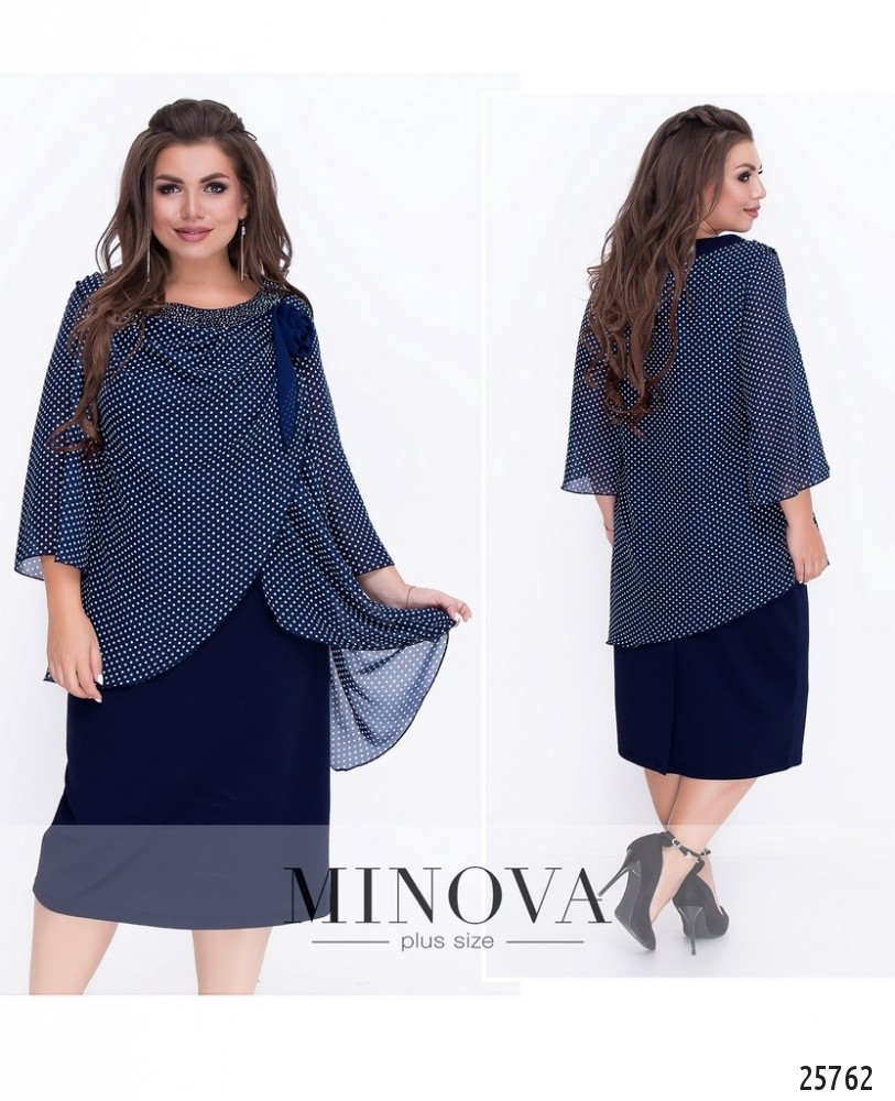 Платье с пришитой драпированной накидкой с мелкими стразами и объемным цветком. Нижний слой – платье футляр из плотной однотонной ткани. Верхний слой – полупрозрачный шифон с рисунком. Накидка удлинена на спине. Свободные рукава длиной ¾. Изделие без молний и застежек.