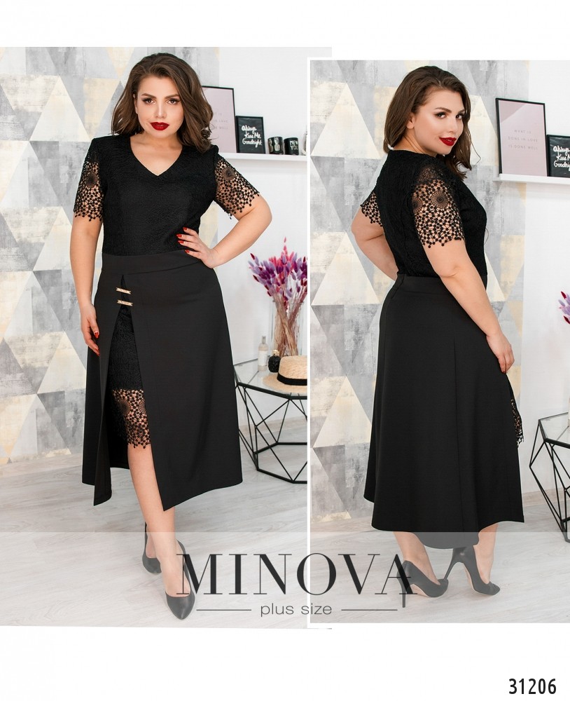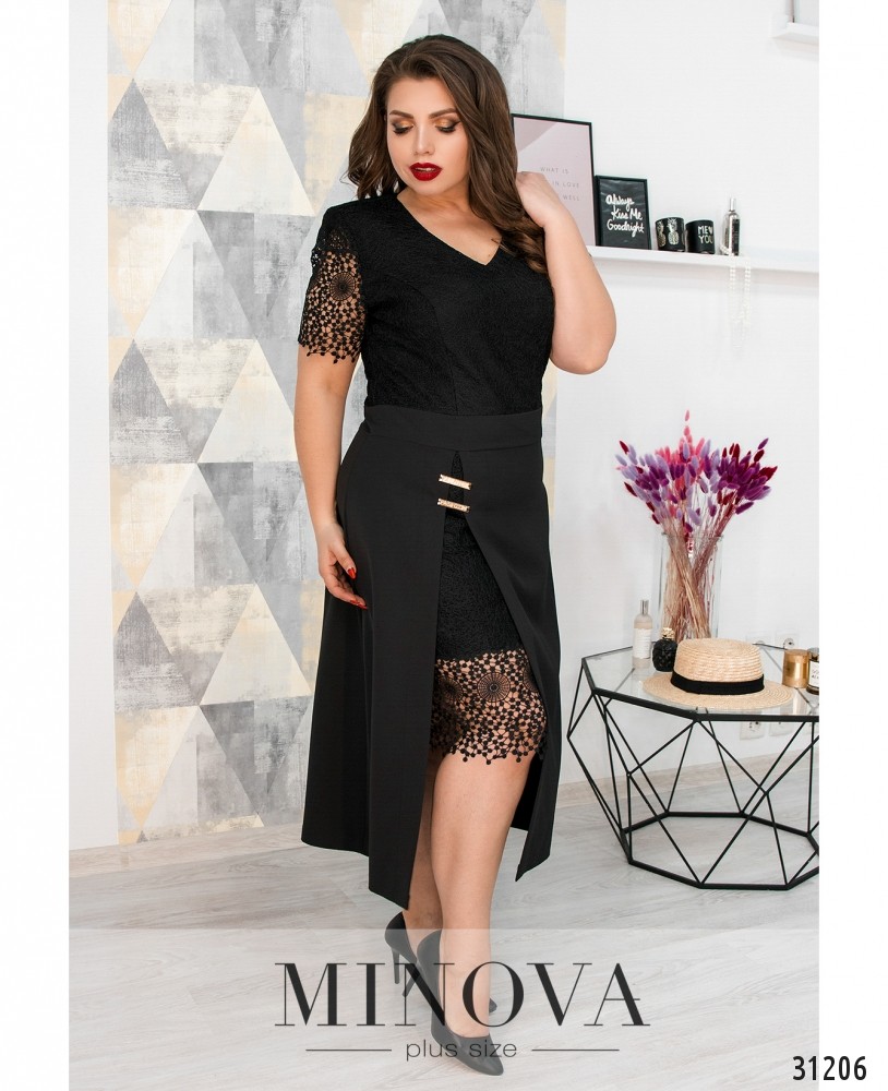 Элегантное платье с двойной юбкой. Отрезной лиф с короткими рукавами отделан кружевом. Рукава выполнены в технике кроше. Отрезной от талии подол выполнен из двух слоев: подъюбника и верхнего слоя с разрезом. Нижний слой платья выполнен на подкладке и оформлен сверху кружевом и кроше. Верхний слой изготовлен из однотонного материала и закреплен двумя металлическими деталями. На спине платье застегивается на скрытую молнию.