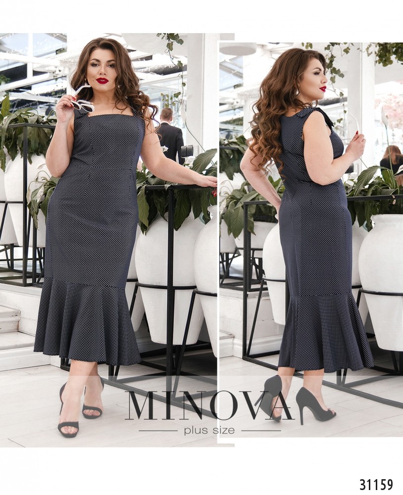 Эффектная женственная модель в мелкий горошек. Платье по фигуре силуэта «русалака» с отрезным подолом с воланами. Линия декольте выполнена в форме квадрата с широкими бретелями. Бретели украшены лентами в тон. На спине платье застегивается на скрытую молнию.
