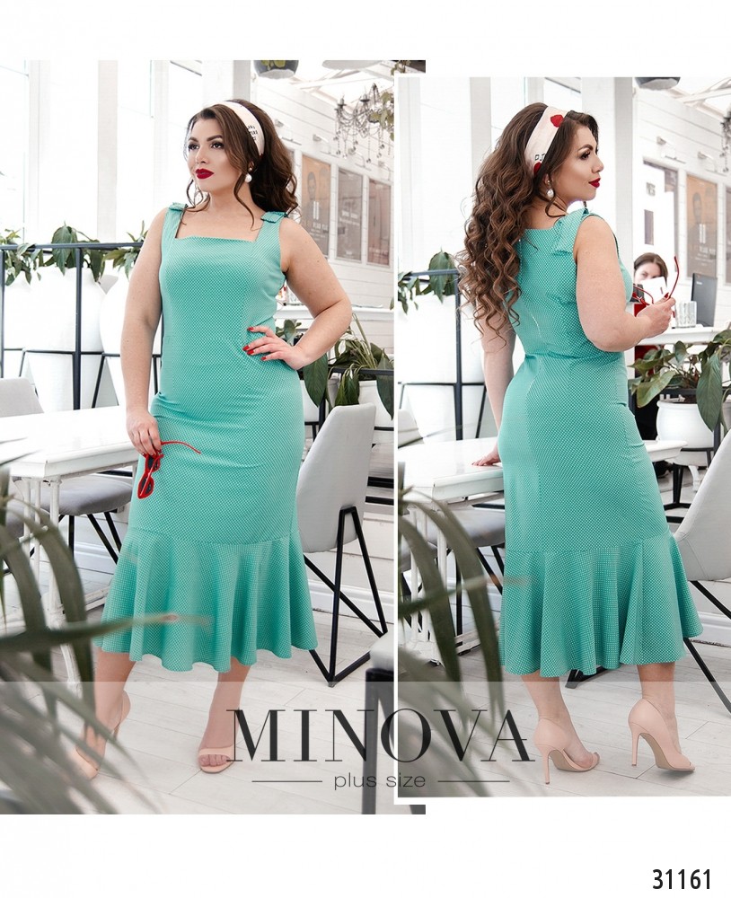 Эффектная женственная модель в мелкий горошек. Платье по фигуре силуэта «русалака» с отрезным подолом с воланами. Линия декольте выполнена в форме квадрата с широкими бретелями. Бретели украшены лентами в тон. На спине платье застегивается на скрытую молнию.