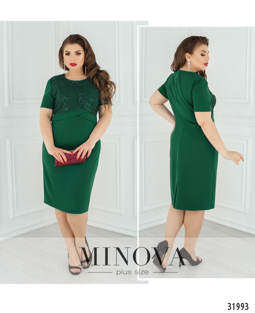 Элегантное платье с отделкой из сетки с вышивкой. Платье выполнено из однотонного материала. Лиф платья дополнен верхним слоем, представленным сеткой с вышивкой. Талия подчеркнута двумя фигурными линиями. На спине вшитая молния и разрез по линии шага.