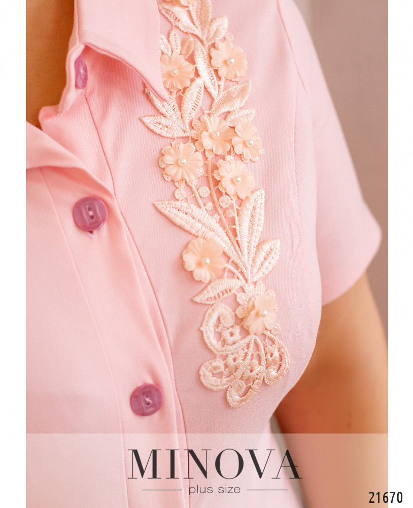 Элегантное и женственное платье с вышивкой-аппликацией с бусинами на плече. Подол отрезной полукруглым швом, асимметричный, по спинке чуть длиннее. Карманов нет. Воротничок отложной, рукава без манжет, на груди полукруглые вытачки до талии. Застёжка - ряд пуговиц спереди на планке.