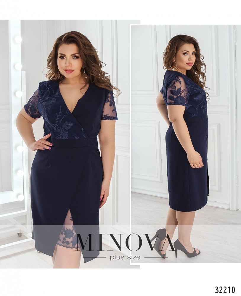 Платье «конверт» с вставкой из сетки с вышивкой. Платье с отрезной линией талии, лифом и подолом на запАх. Короткие рукава выполнены из сетки с вышивкой. Лиф с одной стороны дополнен сеткой. Подол так же дополнен сеткой с вышивкой. На спине платье застегивается на вшитую молнию и дополнено разрезом по линии шага.