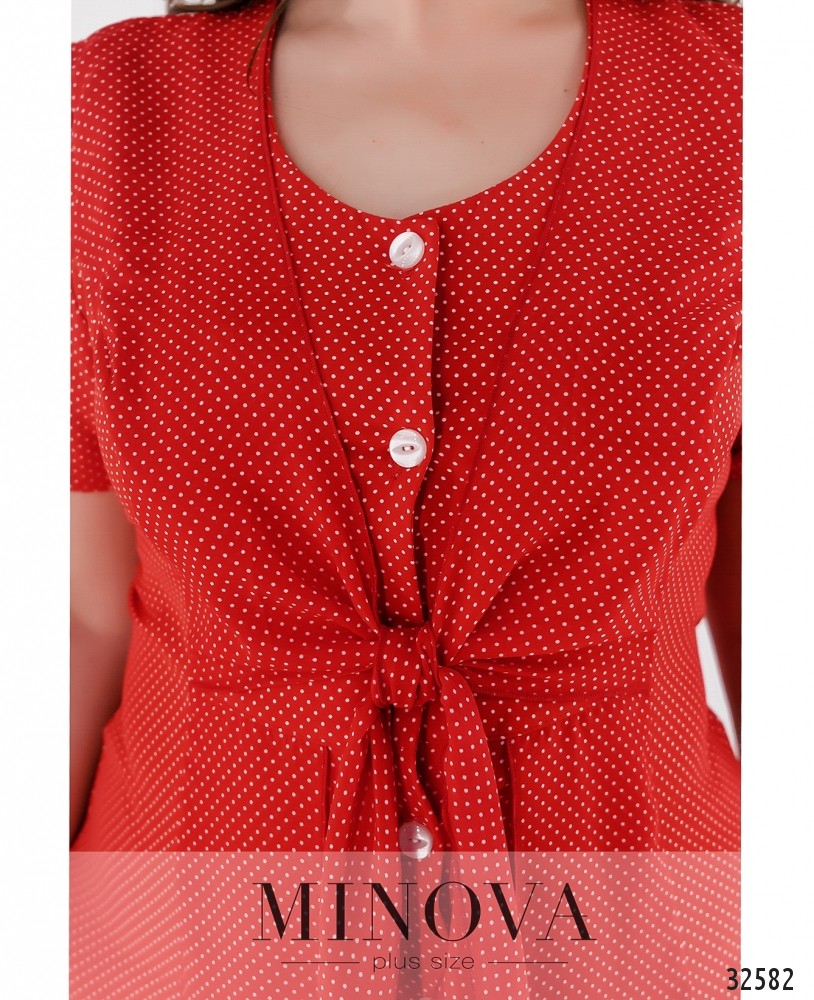Яркое, летнее, такое свободное платье с запАхом в мелкий горох – из новой летней коллекции платьев большого размера от Minova. Кроме запАха, застёгивается на пуговицы до низу, сзади на талии тоже есть завязки, с помощью которых можно регулировать очертания талии. Платье А-силуэта, очень расклешено к низу, ткань отлично тянется и «дышит». Такой броский наряд можно надеть и на прогулку, и на пляж, и даже в офис – когда начальство в отпуске! Благодаря регулировке пояса и завязок, будет выгодно смотреться на девушках с фигурой «песочные часы», «треугольник» и «прямоугольник».