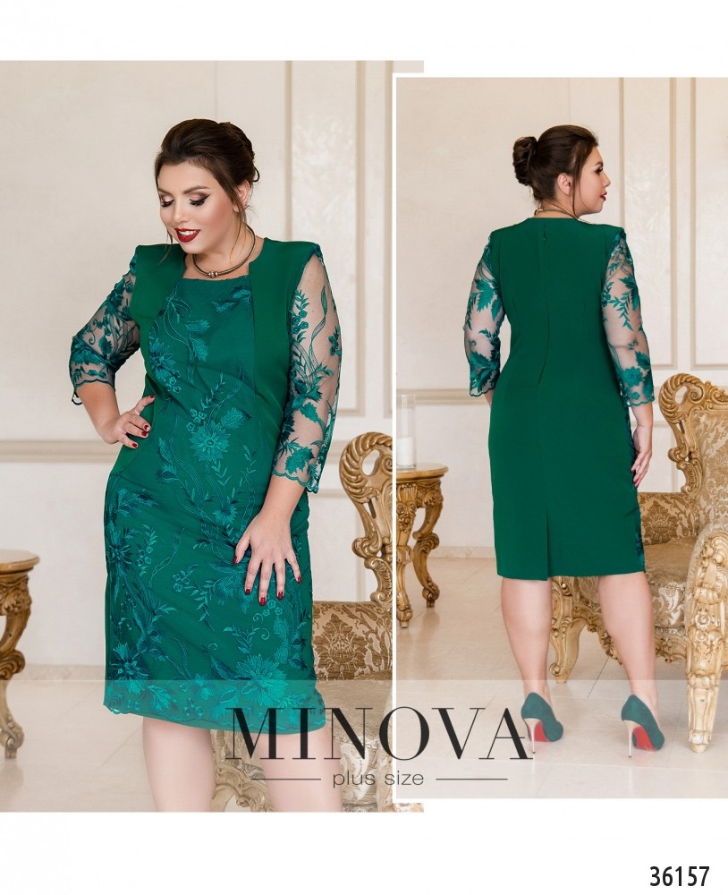 Приталенное платье батал из свежей коллекции женской одежды больших размеров от Minova покорит ваше сердце с первого взгляда своим оригинальным фасоном. Платье А-силуэта, с полукруглым вырезом горловины, без карманов и застёжек. На плечи изнутри подшиты накладки, которые делают линию плеч более ровной. Платье двуслойное спереди: от горловины до подола подшит второй слой из сеточки с цветочным узором. Визуально платье выглядит, словно на него накинута жилетка из гладкой ткани. Спинка полностью гладкая. Рукава длиной ¾. Платье будет хорошо сочетаться с однотонной обувью на каблуке любой высоты.