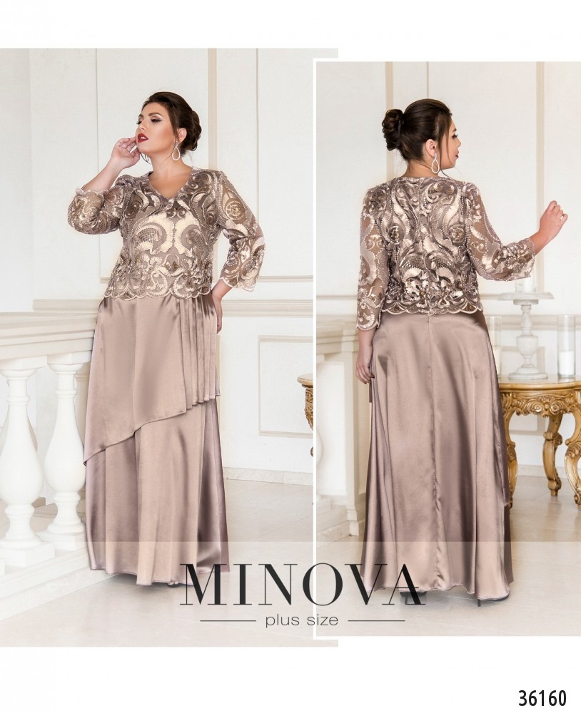 Необычный фасон представленного в новом каталоге Minova платья батал делает эту модель праздничной, нарядной и привлекательной. Платье сочетает шелковистую ткань подола и подкладки и ажурную сеточку с пайетками и лентами, создающими цветочный узор. Платье А-силуэта, на подоле – плиссированные складки и несколько слоёв, благодаря чему он выглядит более объёмным. Сверху к лифу подшита накидка, рукава без подкладки, длиной ¾. Вырез горловины полукруглый, неглубокий. Застёжка – вшитая по спинке змейка, карманов нет. Прекрасный выбор для вечеринки или более официального торжественного мероприятия.