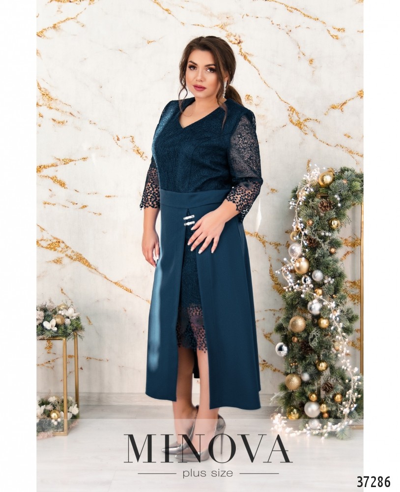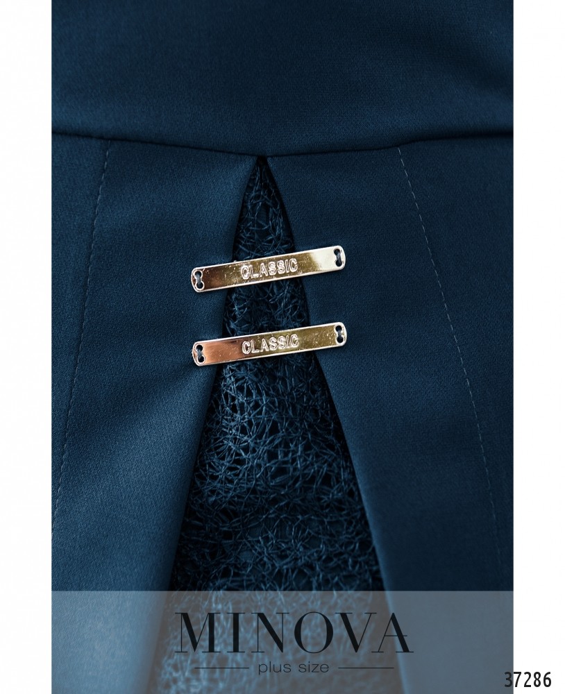 Романтичное платье батал с ажурным кружевом на лифе и гладким подолом. Лиф с подкладкой, на подоле треугольный разрез с кружевной подкладкой, под кружевом – мягкая подкладка. Вырез горловины неглубокий, V-образный. Застёгивается на потайную молнию сзади на спине. На подоле декоративные металлические нашивки, скрепляющие вырез. Рукава из кружева без подкладки, без манжет.