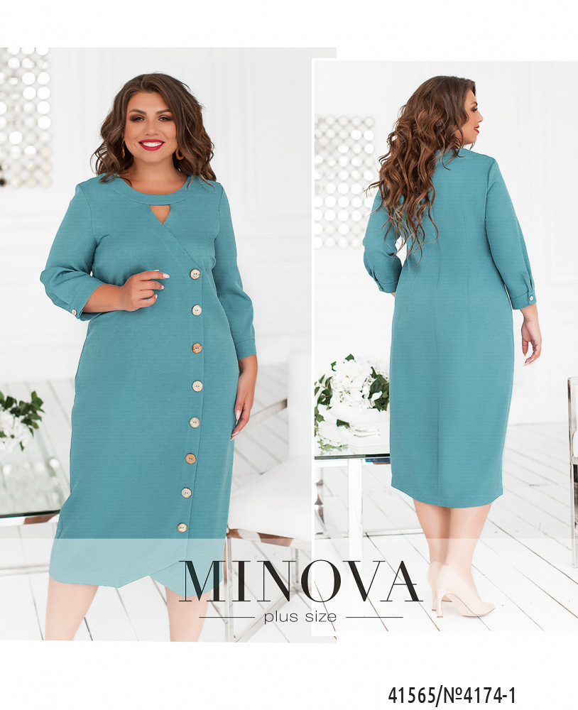 Оригинальное платье плюс сайз с рядом декоративных пуговиц спереди на планке. Рукава с небольшими манжетами, на манжетах по одной пуговице. Вырез горловины полукруглый, под ним - небольшой треугольный вырез. На груди вытачки, карманов нет, силуэт приталенный. Застёгивается на молнию, вшитую по спинке.