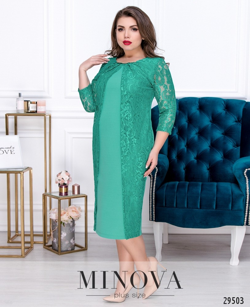 Оригинальное платье по фигуре с кружевной драпировкой и рукавами ¾. Горловину дополняет нежное украшение (украшение пришито). На спине подол дополнен разрезом по линии шага.