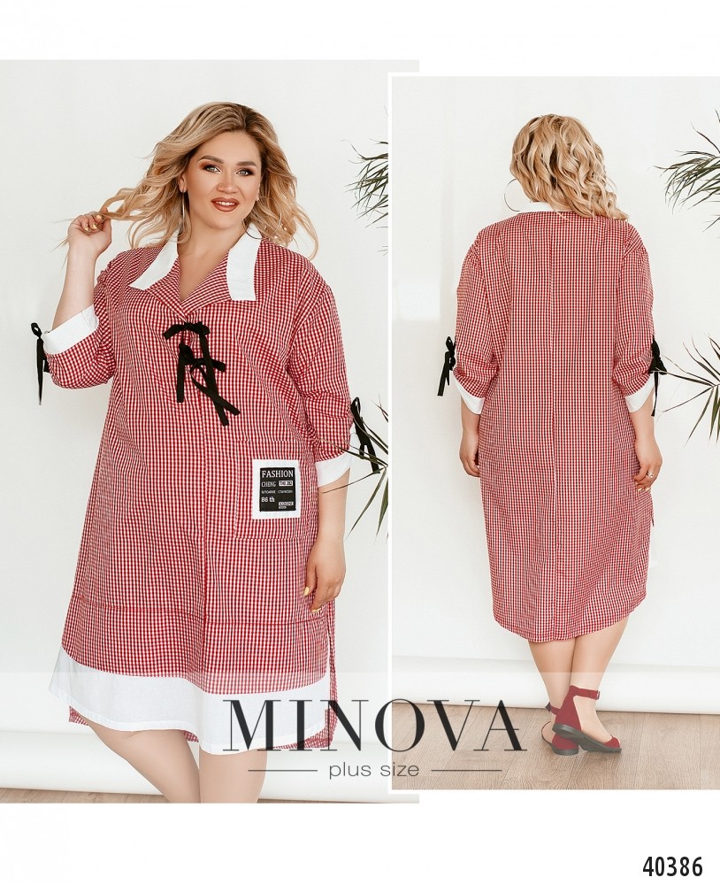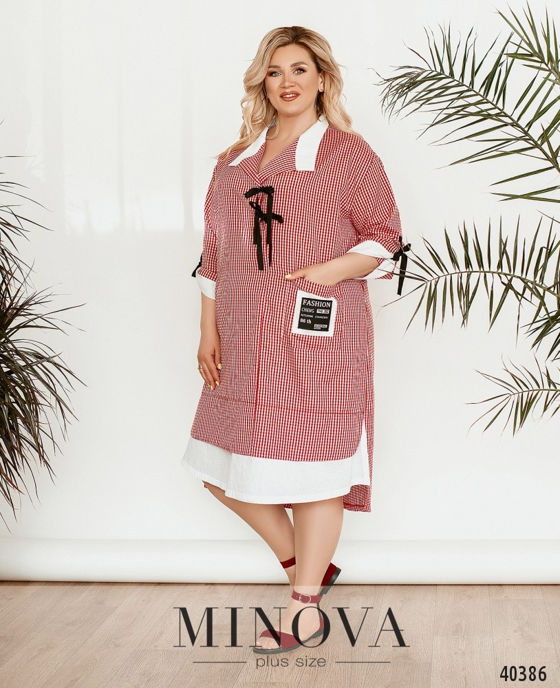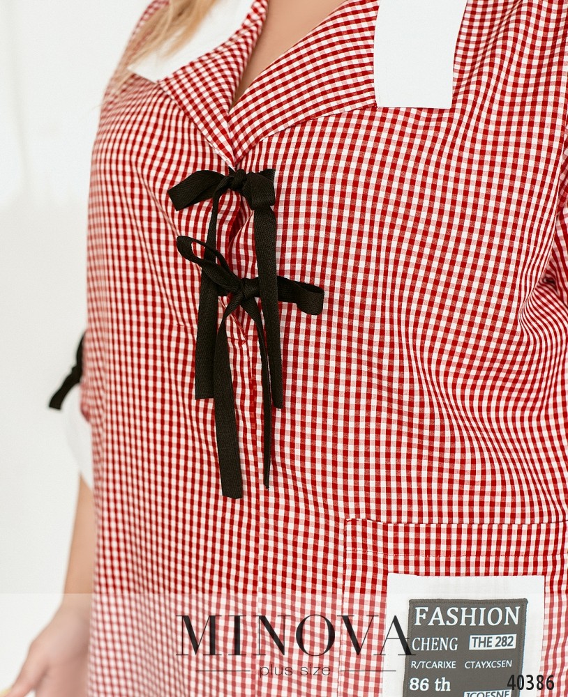 Стильное платье большого размера в мелкую клетку, с воротником типа "лацканы", с двумя лентами-завязками на вырезе. Сбоку на левом бедре - накладной карман с декором. Рукава также с регулировочными лентами. К подолу снизу спереди подшита более лёгкая ткань, по спинке чуть длиннее, по бокам - разрезы.