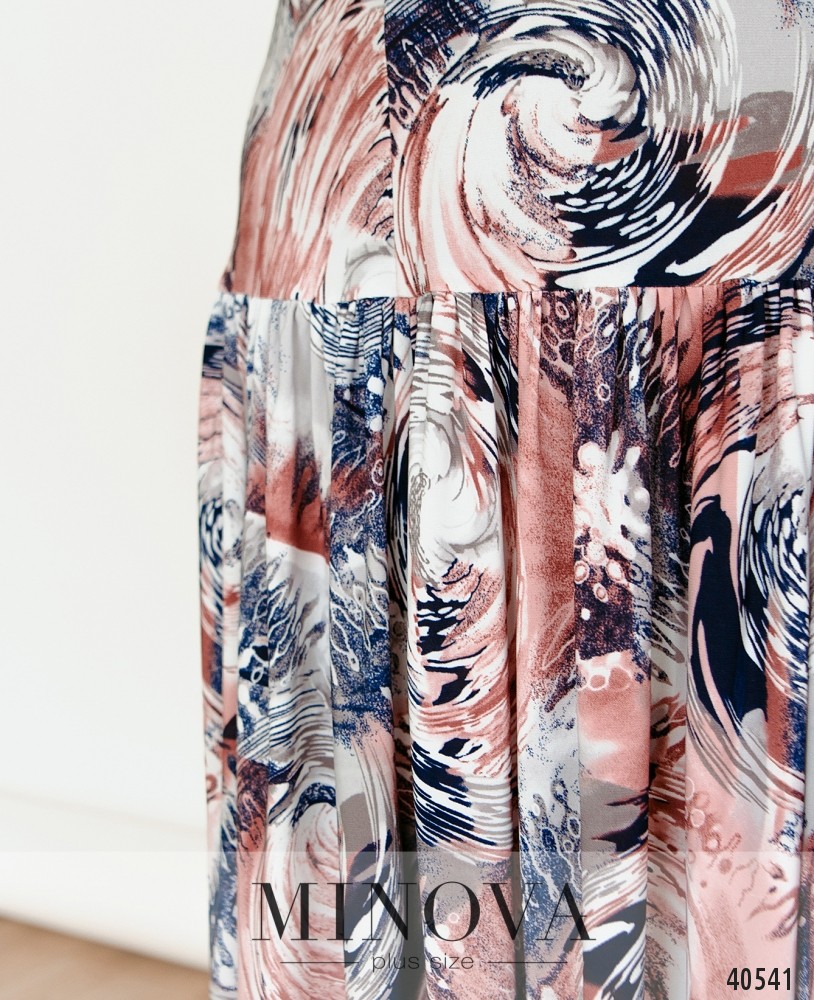 Оригинальное платье батал с ярким принтом, без застёжек и карманов, подол с подшитыми длинными оборками, рукава короткие, без манжет. Вырез горловины полукруглый.