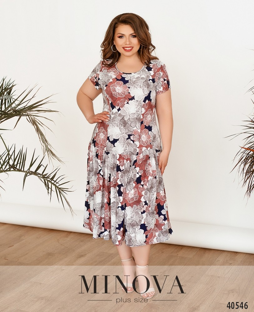 Оригинальное платье батал с ярким принтом, без застёжек и карманов, подол с подшитыми длинными оборками, рукава короткие, без манжет. Вырез горловины полукруглый.