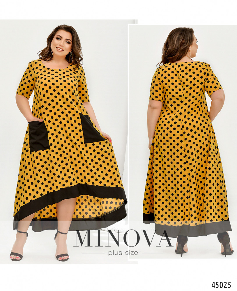 Оригинальное платье батал без застёжек, с яркими контрастными накладными карманами на бёдрах и окантовкой асимметричного подола - по спинке длиннее. Вырез горловины полукруглый, рукава без манжет, на груди вытачки.
