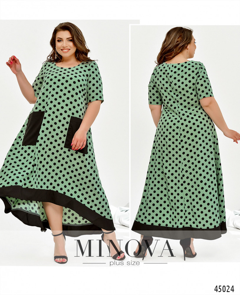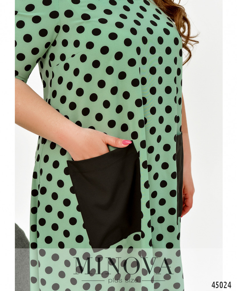 Оригинальное платье батал без застёжек, с яркими контрастными накладными карманами на бёдрах и окантовкой асимметричного подола - по спинке длиннее. Вырез горловины полукруглый, рукава без манжет, на груди вытачки.