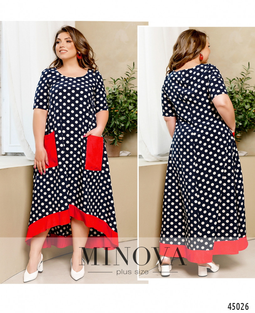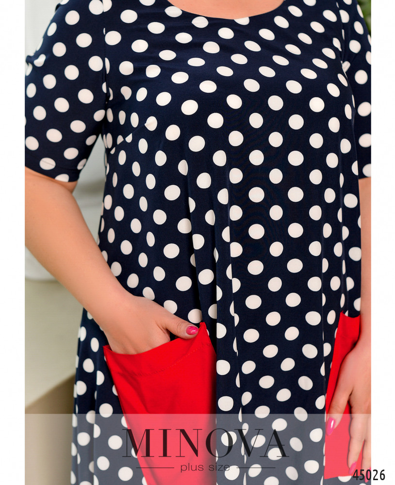 Оригинальное платье батал без застёжек, с яркими контрастными накладными карманами на бёдрах и окантовкой асимметричного подола - по спинке длиннее. Вырез горловины полукруглый, рукава без манжет, на груди вытачки.