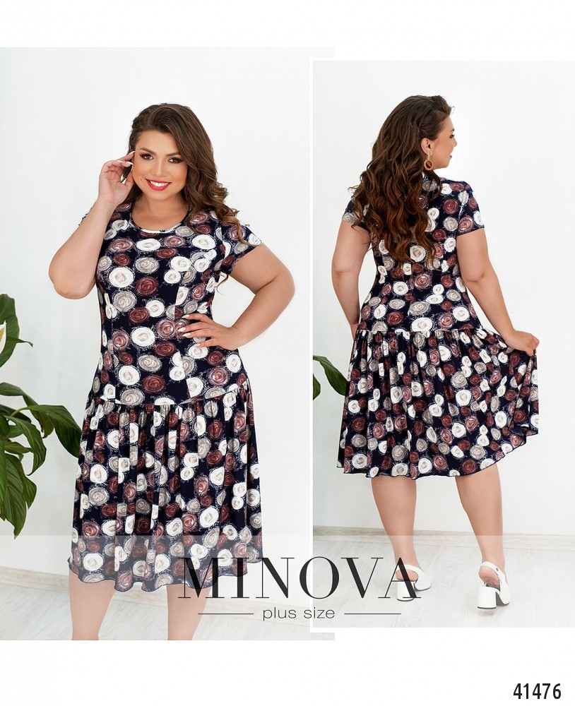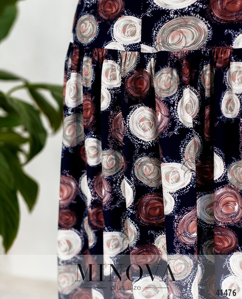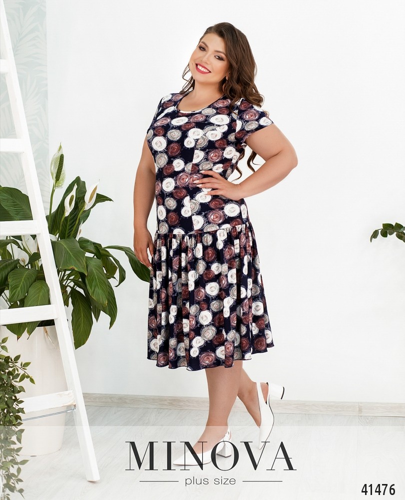 Очаровательное платье большого размера с цветочным принтом. Застёжек и карманов нет, вырез горловины полукруглый, подол с подшитыми мягкими оборками. Рукава без манжет.