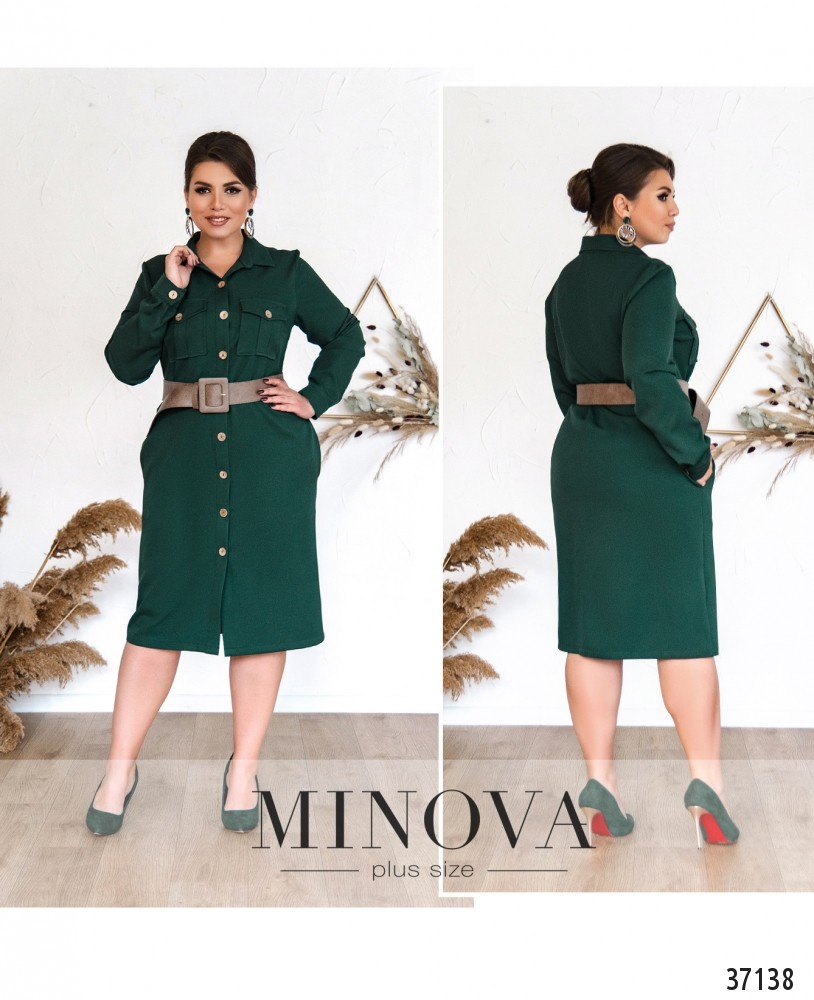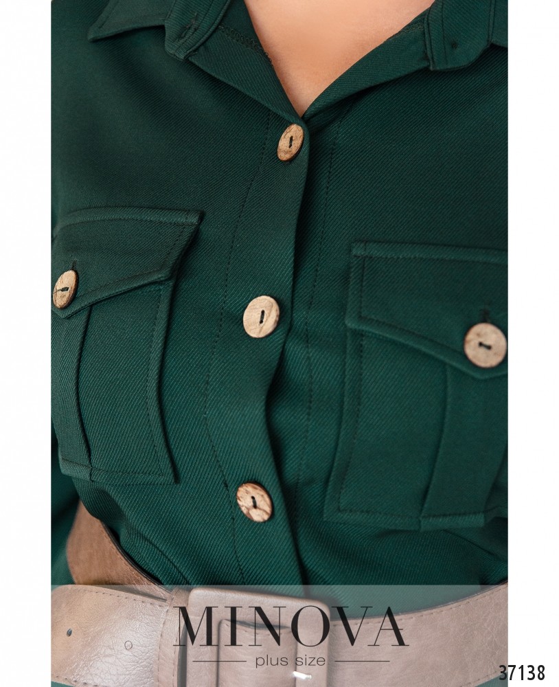 Осенне-зимний гардероб стоит дополнить строгой, но оригинальной моделью платья батал. Minova предлагает отлично подходящую модель: платье в стиле рубашки, приталенное, из мягкой ткани. Воротник отложной, застёжка – ряд пуговиц от воротника до подола. На груди два накладных функциональных кармана с листочками и пуговицами. Рукава полной длины, с небольшими манжетами, на манжетах по одной пуговице. По бокам – врезные карманы, на груди – диагональные вытачки на карманах. Особого изящества наряду добавляет плотный ремень с крупной пряжкой, который идёт в комплекте. Вы можете экспериментировать с обувью и украшениями. Пояс/аксессуар входит в комплект.