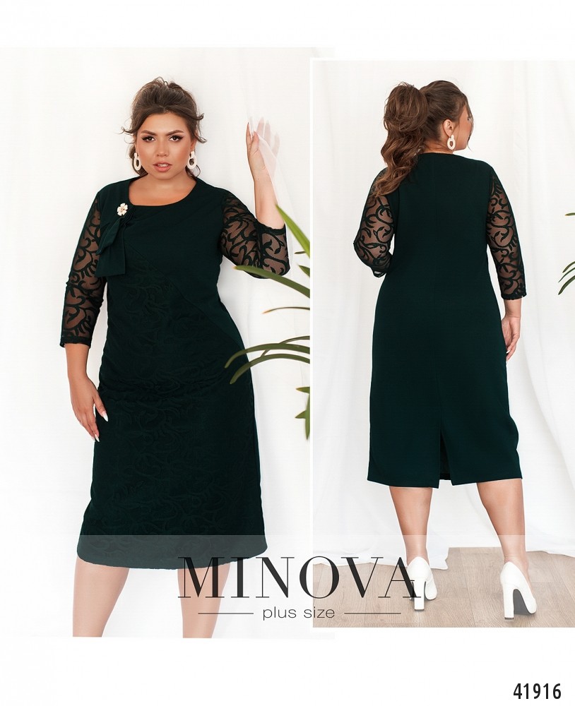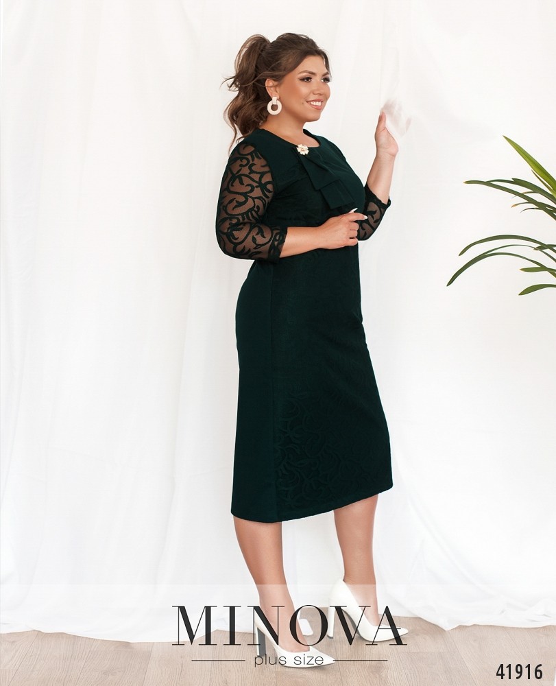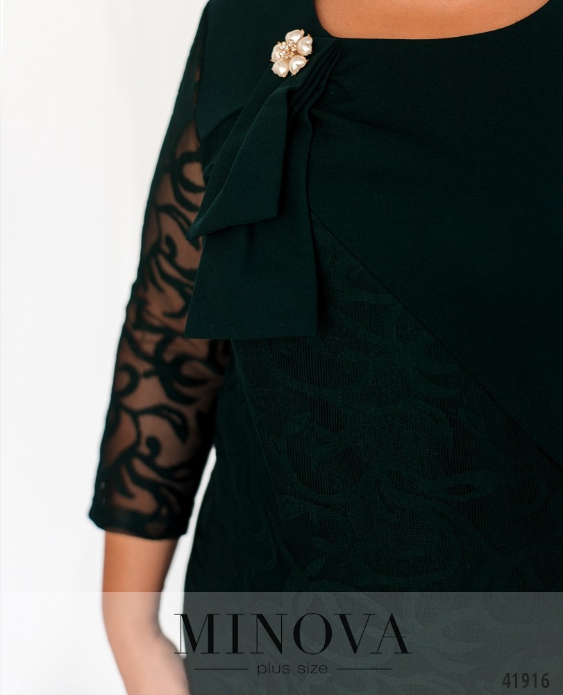 Женственное платье батал с брошью на банте, украшено гипюром на подоле спереди, спинка гладкая. Рукава из гипюра без подкладки. На груди вытачки. Вырез горловины полукруглый, карманов и застёжек нет. Сзади на подоле шлица.