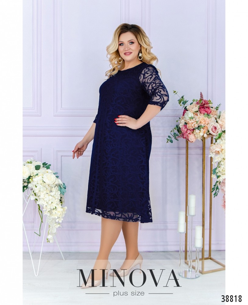 Элегантное платье батал А-силуэта, без застёжек и карманов, с мягкой подкладкой и ажурным гипюром сверху. Рукава из гипюра без подкладки, без манжет. Вырез горловины полукруглый, неглубокий.