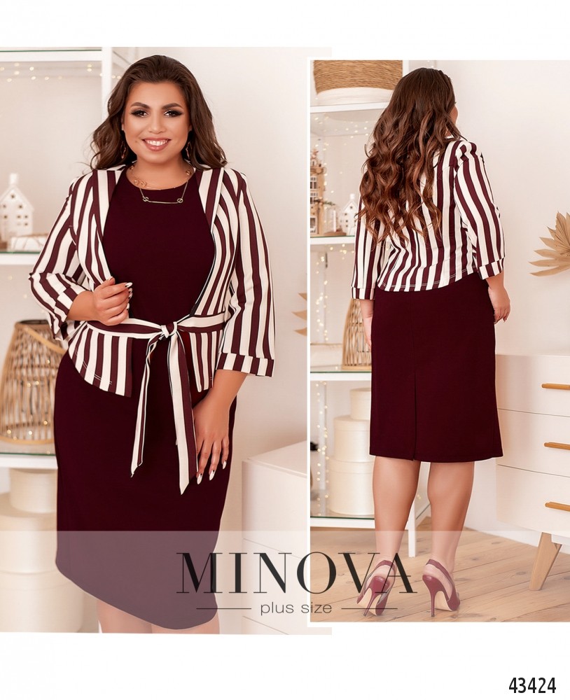 Нарядный костюм большого размера с жакетом и платьем. Платье без рукавов, без карманов и застёжек, вырез горловины полукруглый, сзади на подоле шлица. Жакет без подкладки, с подплечниками, без застёжек и карманов, завязывается на ленты спереди. Лацканы небольшие, рукава с мягкими манжетами без пуговиц.