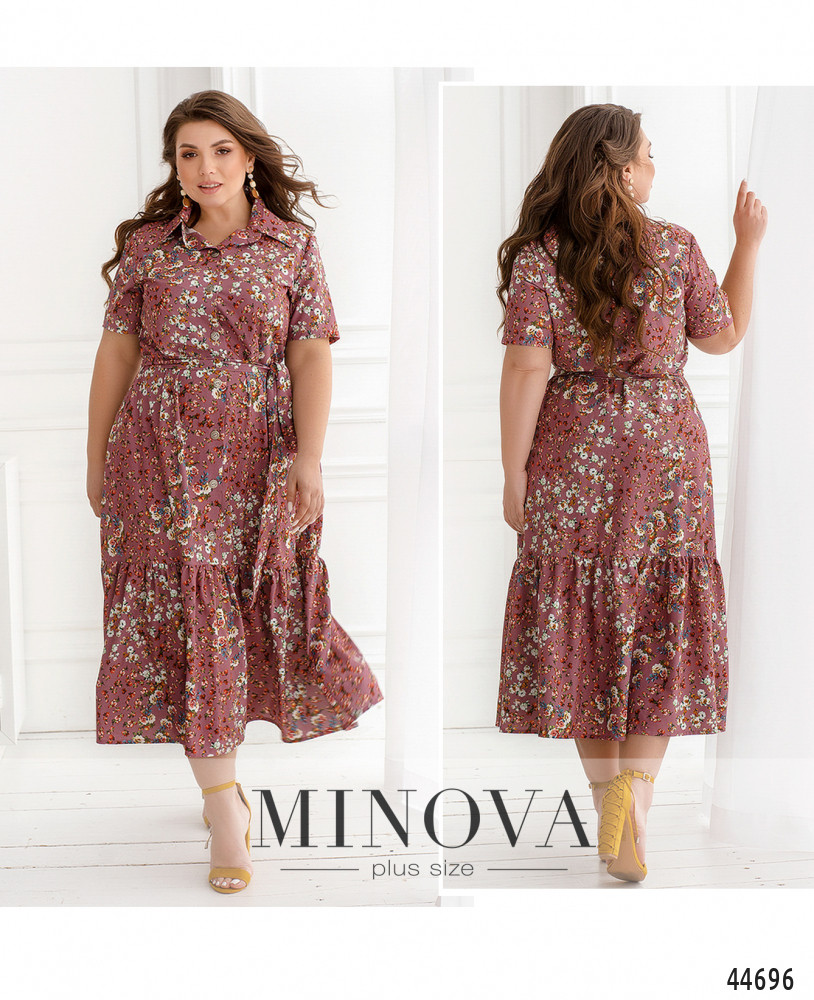 Яркое платье батал с нежным принтом, воротничок отложной, застёжка - ряд пуговиц спереди на планке, от воротничка до оборок, которые украшают подол. Рукава без манжет. Карманов нет.