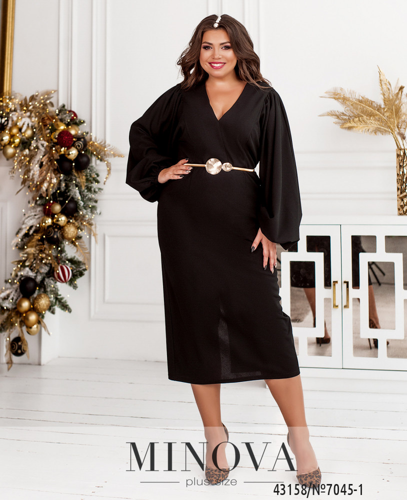 Минималистичное платье батал с пейзанским рукавом - широким по длине и зауженным к запястью, на запястьях вшиты резинки. Лиф подшит на запАх и пришит к подолу, застёжка - молния, вшитая по спинке. Силуэт приталенный, на подоле сзади шлица. Карманов нет.