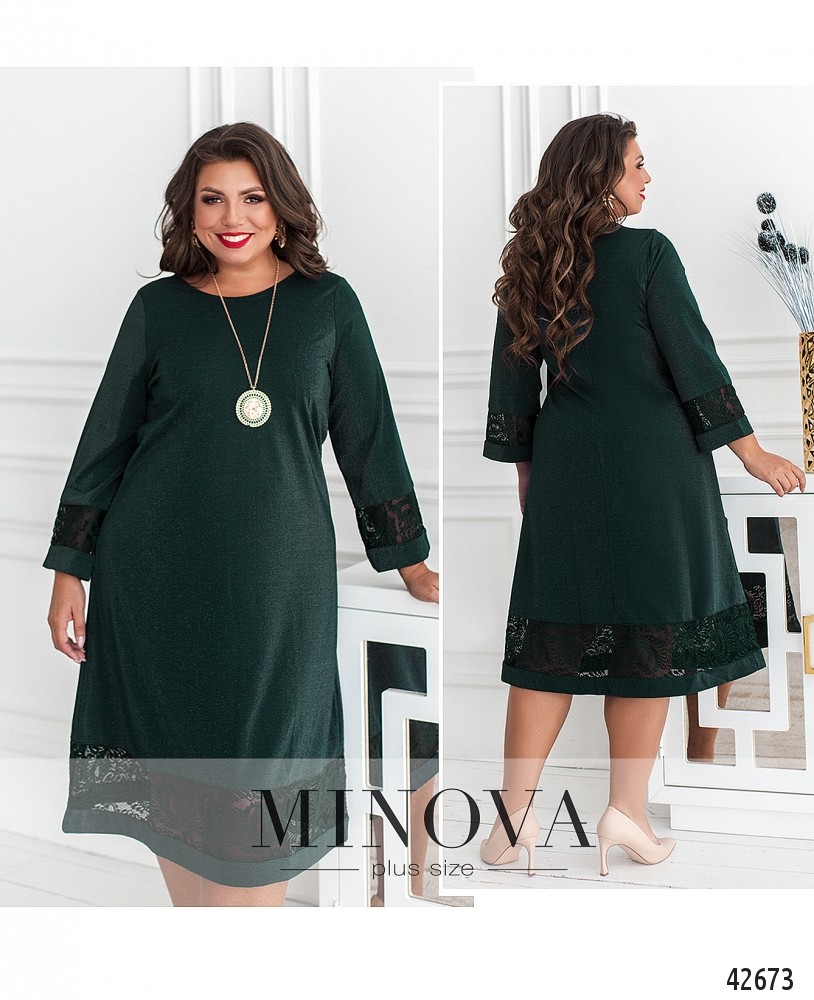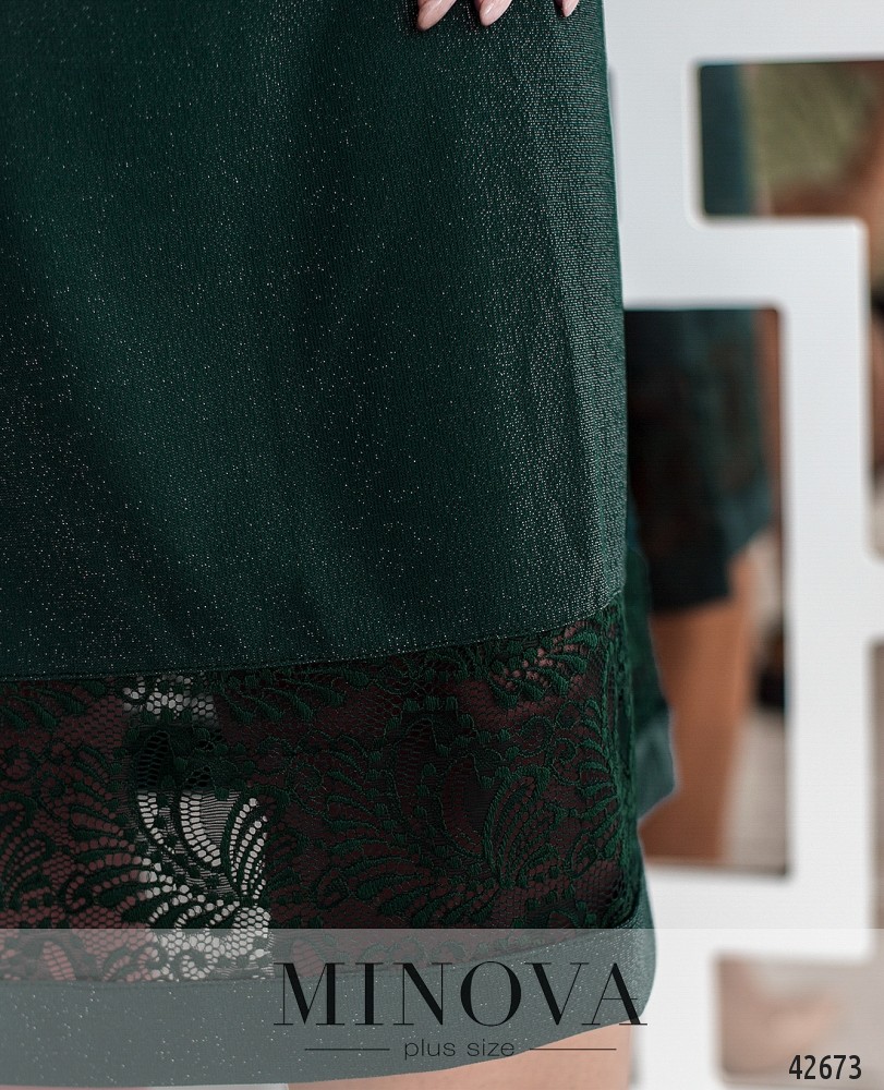 Минималистичное платье большого размера, А-силуэт, без застёжек и карманов, ткань декорирована нитями люрекса. На подоле и на рукавах - вставки кружева. В комплекте подвеска.