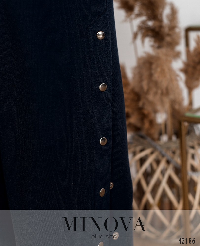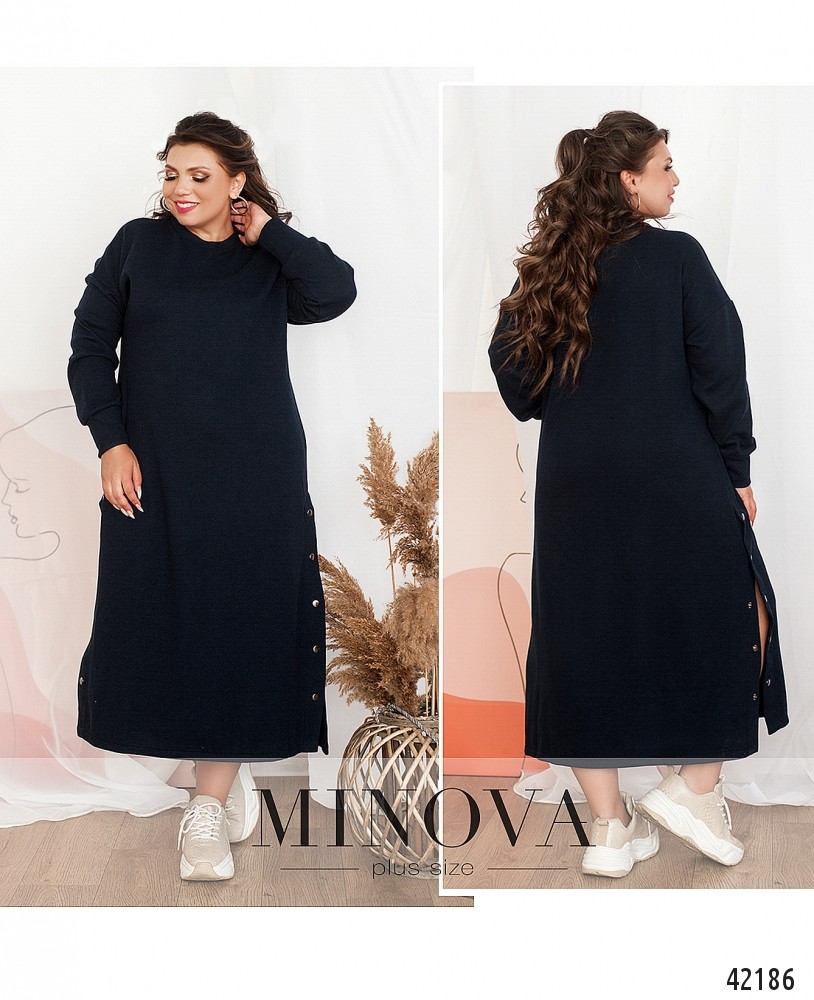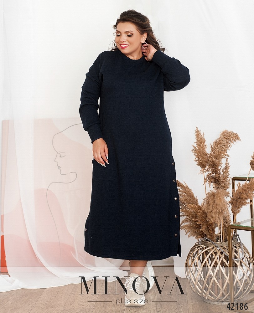 Минималистичное платье плюс сайз без карманов, рукава с мягкими манжетами, по бокам на подоле - рабочие кнопки. Вырез горловины полукруглый.
