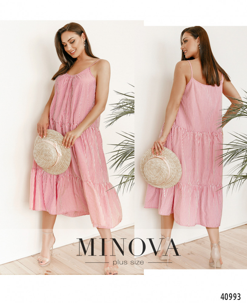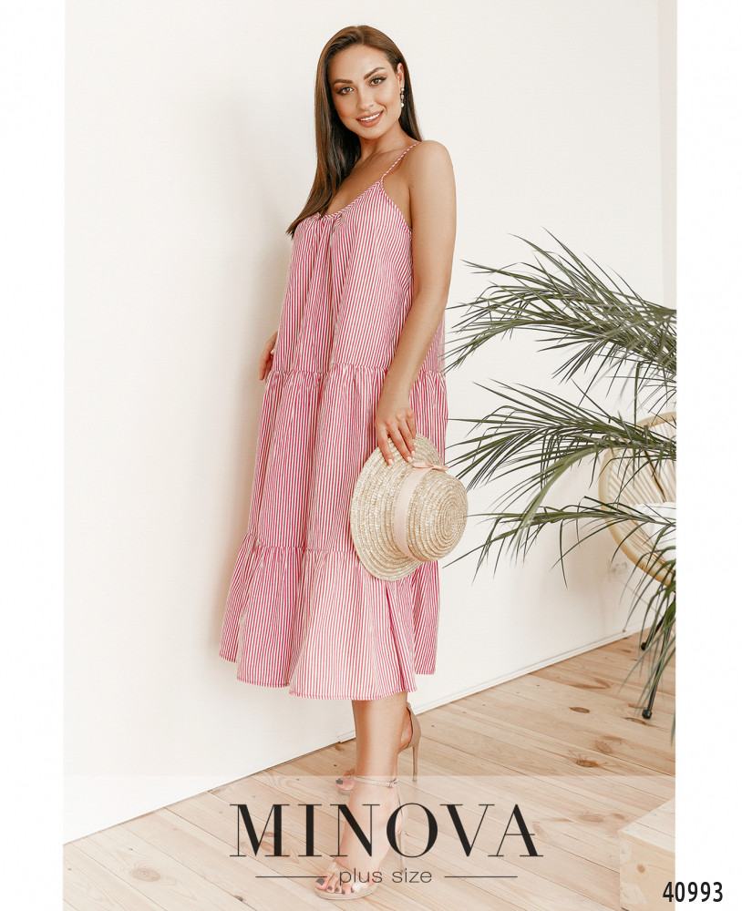 Нежное и лёгкое платье батал А-силуэта, с несколькими рядами длинных мягких оборок, на тонких бретельках. Верх немного присобран под декольте. Карманов и застёжек нет.