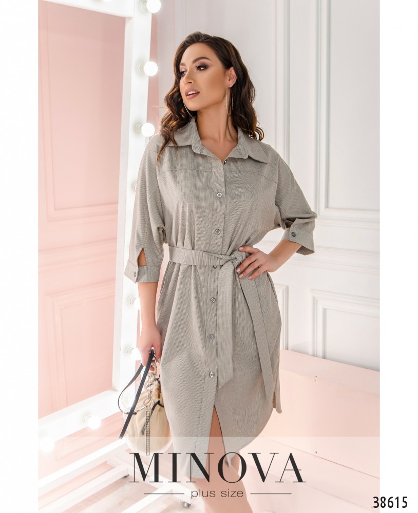 Мягкое повседневное платье батал с поясом, воротничок широкий, отложной, застёгивается на полный ряд пуговиц спереди на планке. Рукава с небольшими манжетами, на манжетах по одной пуговице. На груди и спинке – декоративный шов, шва между рукавом и плечом нет. По бокам подола – небольшие разрезы.