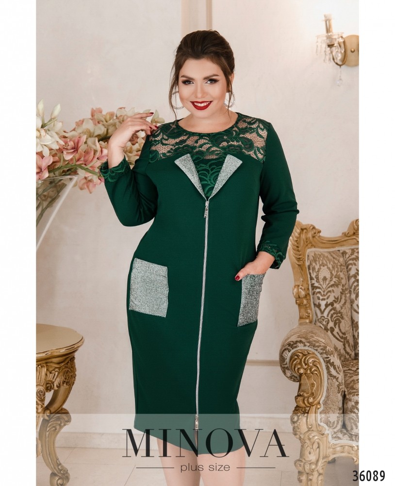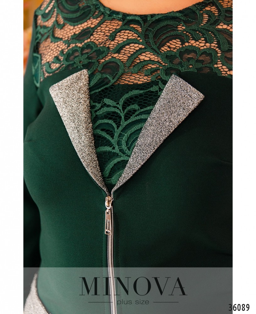 Нарядное и необычное платье батал из свежего пополнения коллекции от Minova. Платье из мягкой, гладкой ткани, со вставками гипюра и блестящего материала с люрексом. Люрексом украшены декоративные лацканы и накладные карманы по бокам. Гипюр – на небольших манжетах и на лифе спереди. По центру – декоративная молния, а рабочая застёжка – вшитая по спинке молния. На груди – небольшие вытачки. Рукава полной длины. Силуэт приталенный, длина до колена. Лучше носить с классической обувью на каблуке или танкетке.