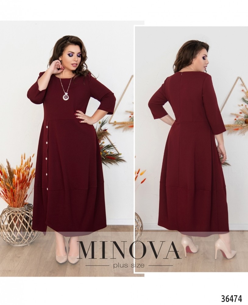 Привлекательное однотонное платье батал А-силуэта представлен в новой коллекции женской одежды батал от Minova. Платье из мягкой, лёгкой ткани. Рукава длиной ¾, без манжет. Вырез горловины полукруглый, неглубокий, подол подшит к лифу, а к низу подола подшит широкий отрез ткани, ещё более расширяющий его. Карманы отсутствуют, застёжка – вшитая по спинке змейка. Спереди на подоле – ряд декоративных пуговиц, на груди – небольшие вытачки. На плечах изнутри подшиты мягкие накладки. Платье можно смело вписать в свой базовый гардероб, дополняя его каждый раз новыми украшениями и выбирая разную обувь. Украшение входит в комплект.