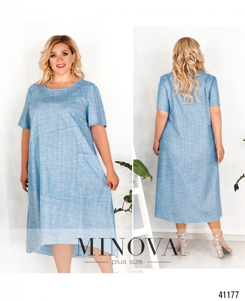 Элегантное платье батал с асимметричными вставками по диагонали, подол длиннее по спинке. На боку - накладной карман, слева сбоку вшита потайная молния. На груди вытачки, вырез горловины полукруглый. Платье А-силуэта.