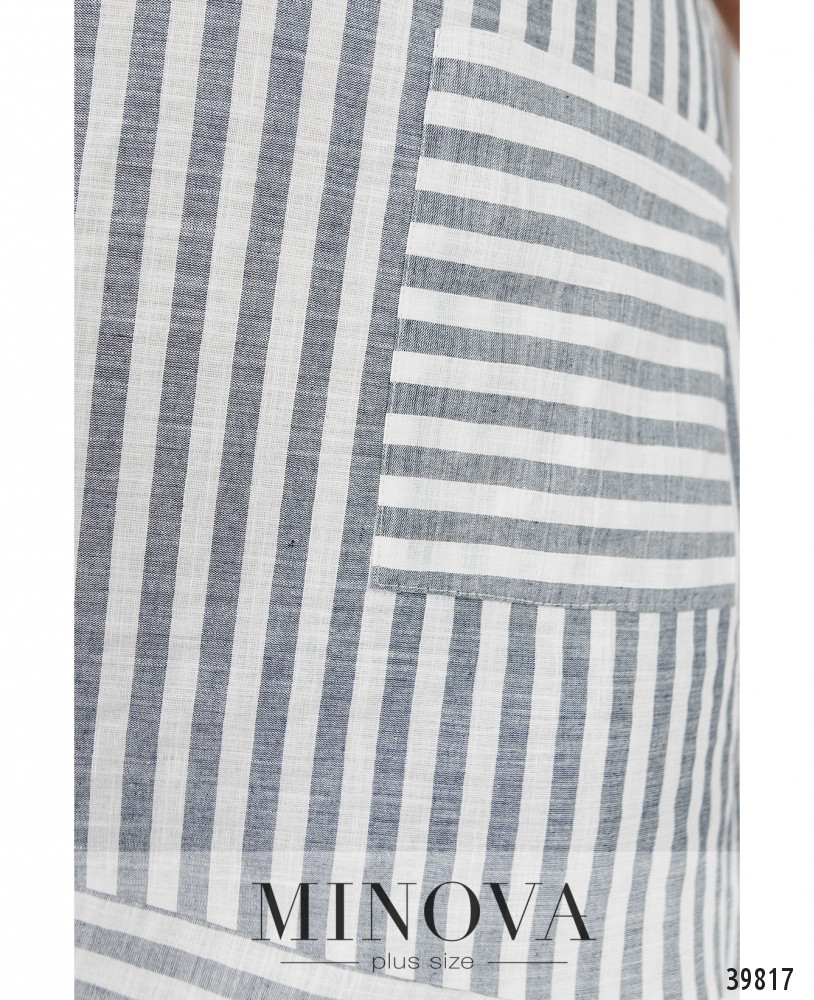 Очаровательное платье батал с разнонаправленным полосатым узором. Слева на подоле - накладной карман. Подол асимметричный, по спинке длиннее. Рукава без манжет. Застёжка - потайная молния, вшитая под левым рукавом.