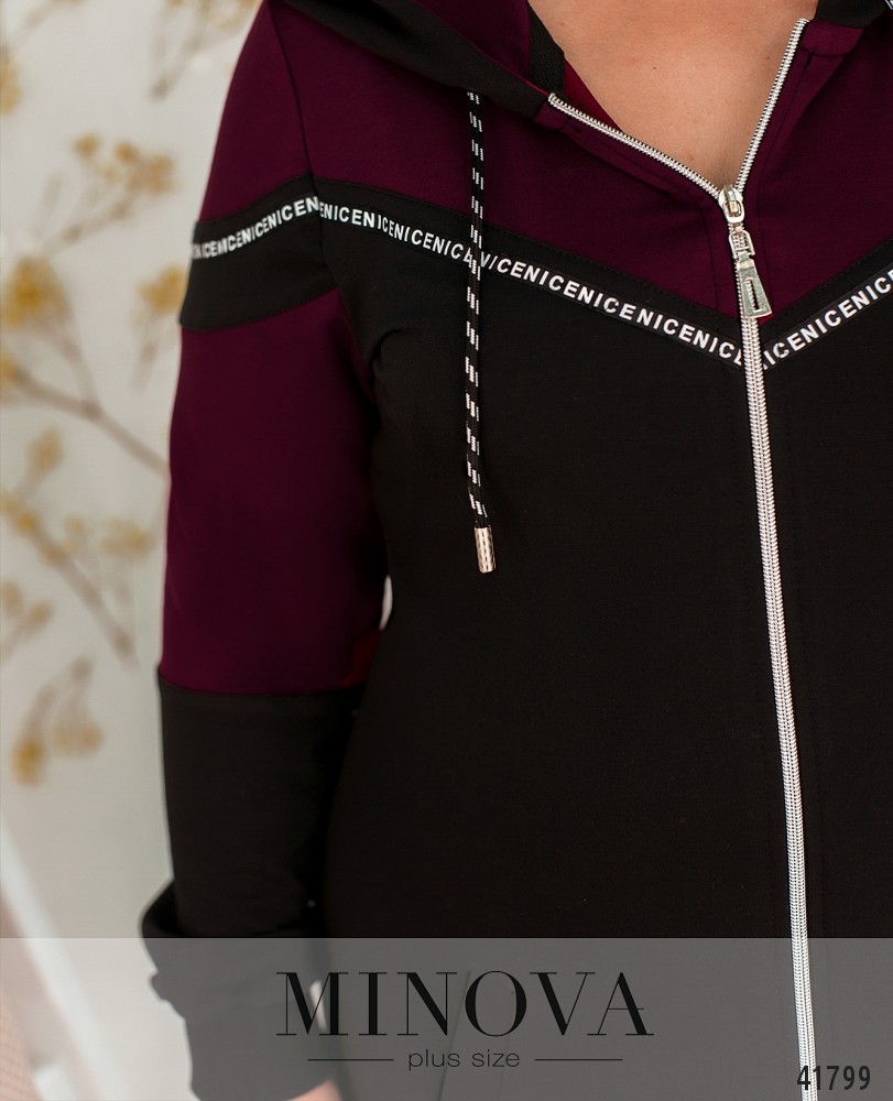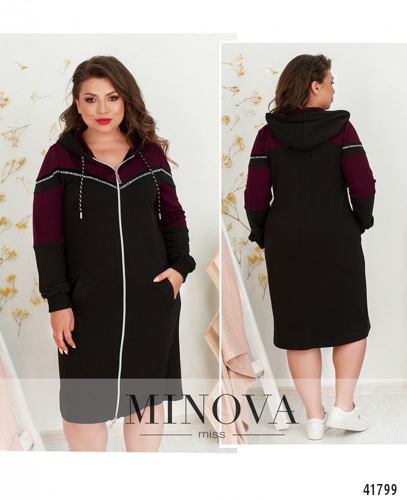 Мягкое спортивное платье большого размера с молнией по центру, от капюшона до низу. Через капюшон пропущен шнурок с наконечниками. Рукава с мягкими манжетами.