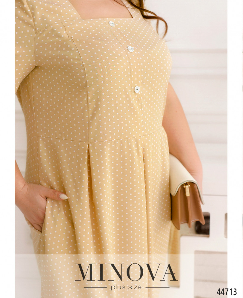 Элегантное и лёгкое платье батал с вырезом горловины "каре", от него до отрезного подола - ряд декоративных пуговиц на талии. Рабочая застёжка - молния, вшитая сзади по спинке. Рукава короткие с вырезом. На талии вытачки, ткань подола присобрана. По бокам - карманы в шве.