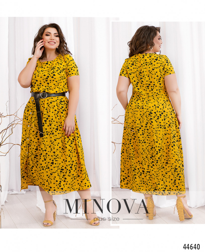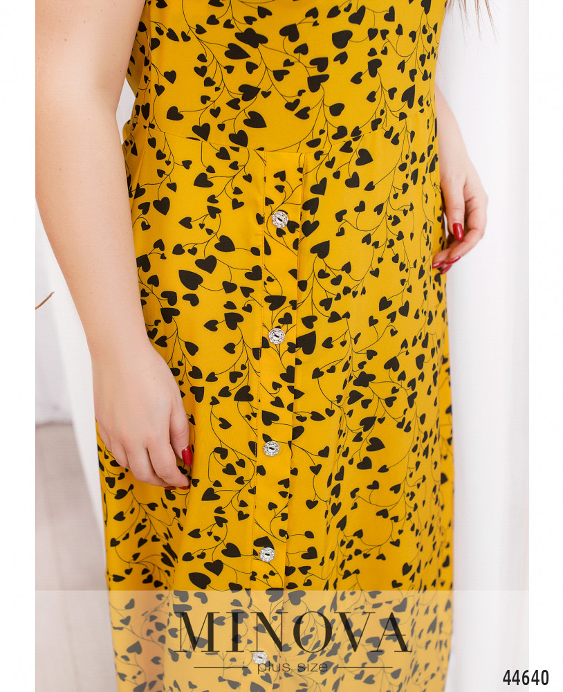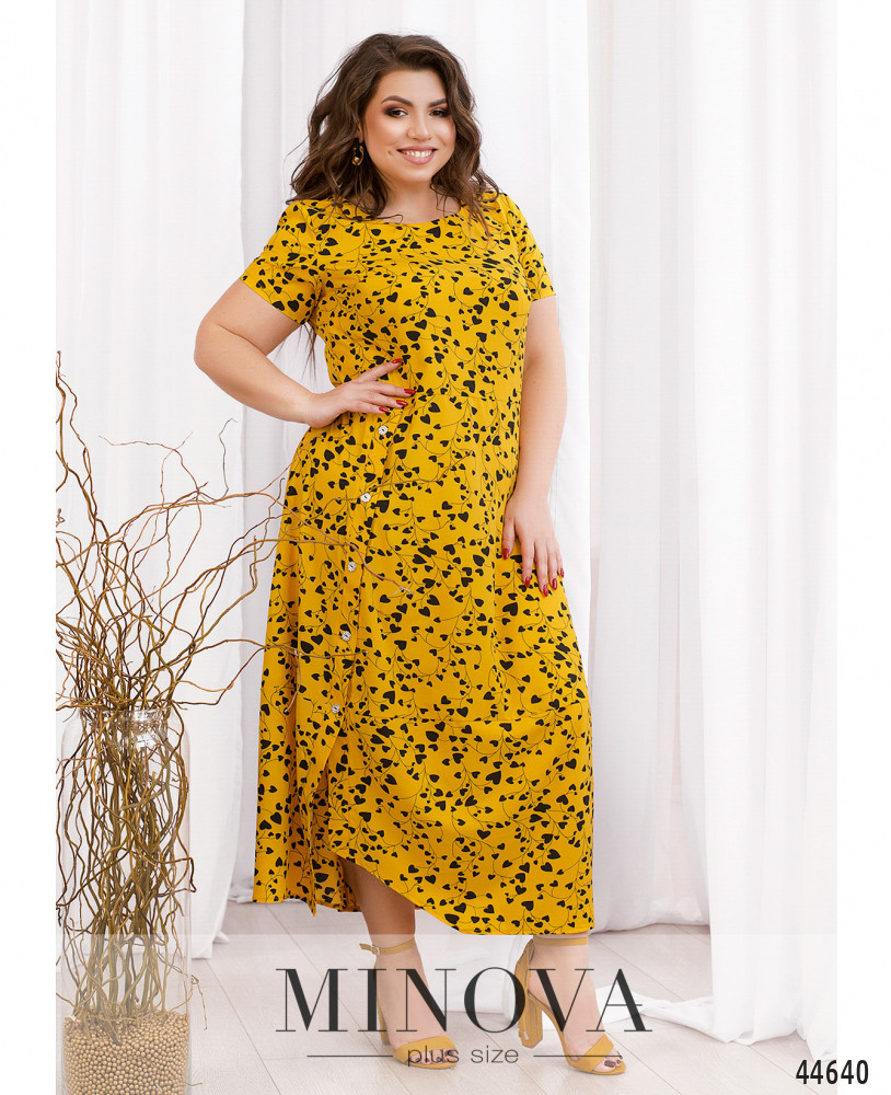 Изысканное платье батал с ярким принтом, рукава короткие, без манжет. Вырез горловины полукруглый. Застёжка - молния, вшитая по спинке. Подол отрезной, на нём декоративные пуговицы на планке, под ней небольшой разрез. Карманов нет.