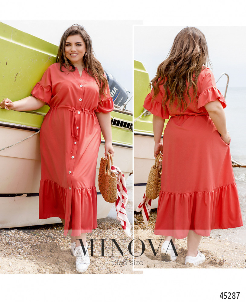 Яркое платье батал с короткими рукавами-оборками, застёжка - ряд пуговиц спереди на планке. Подол с длинными оборками. По бокам - карманы в шве. Через талию под кулиской пропущен шнурок.