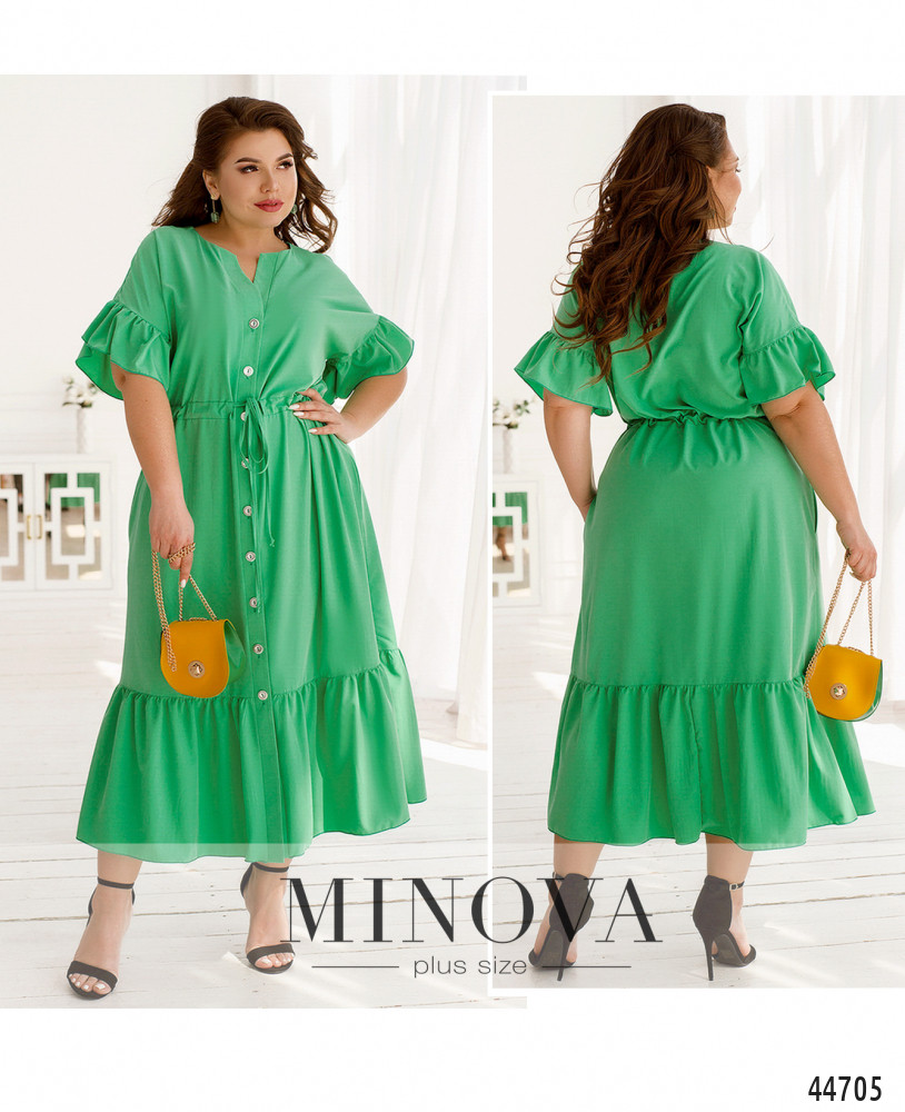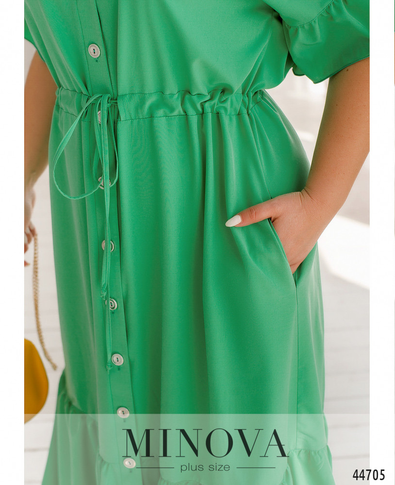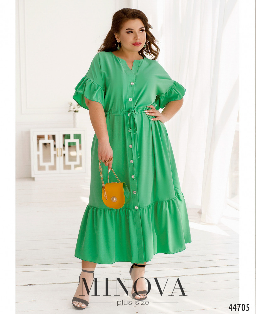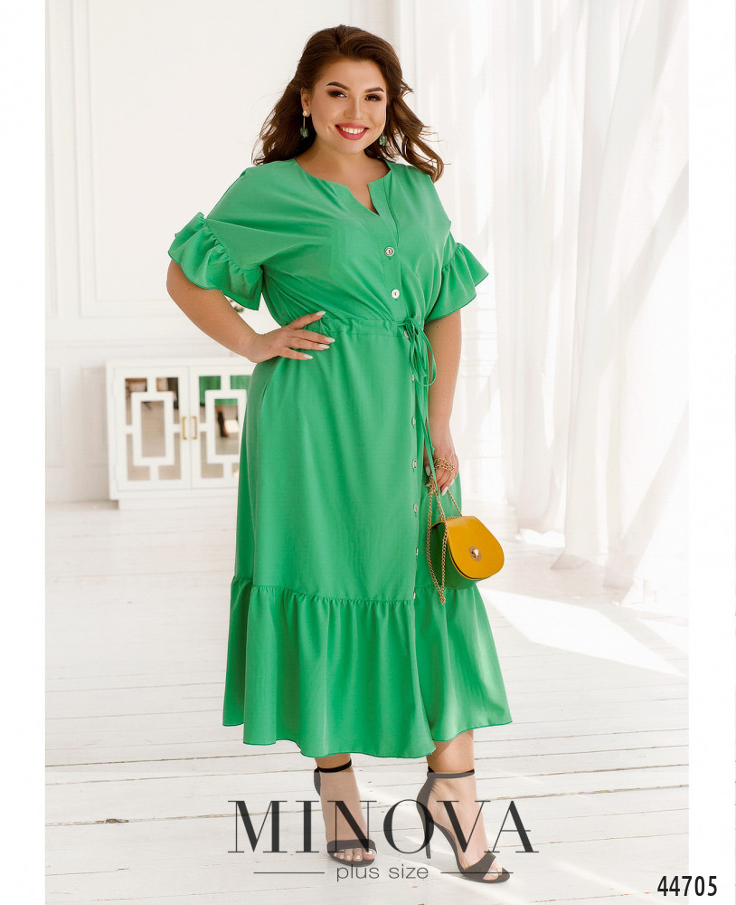 Нежное и женственное платье батал с рядом пуговиц спереди на планке, от полукруглого выреза горловины до низа подола. Подол украшен мягкими оборками. Через талию пропущен шнурок под кулиской. Рукава с приспущенной линией плеча, украшены оборками. По бокам - карманы в шве.