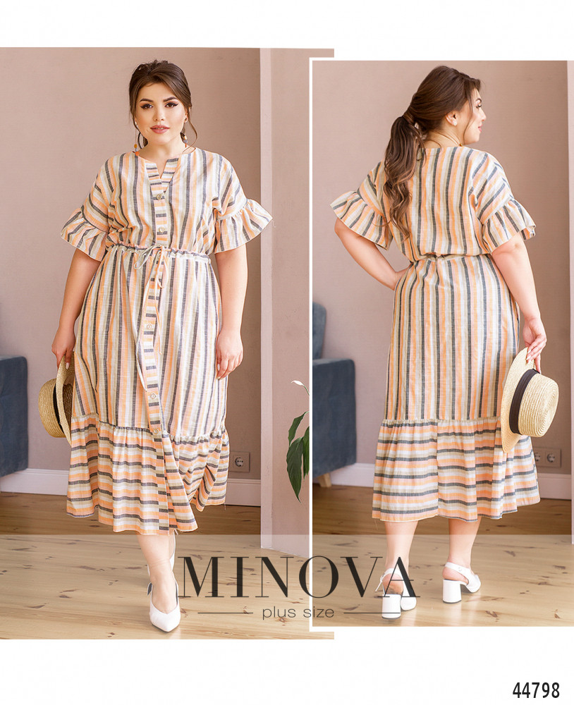 Яркое платье батал с короткими рукавами-оборками, застёжка - ряд пуговиц спереди на планке. Подол с длинными оборками. По бокам - карманы в шве. Через талию под кулиской пропущен шнурок.